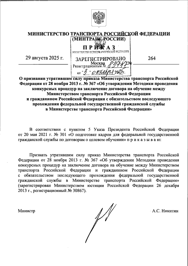 ПРИКАЗ Минтранса РФ от 29.08.2025 N 264
