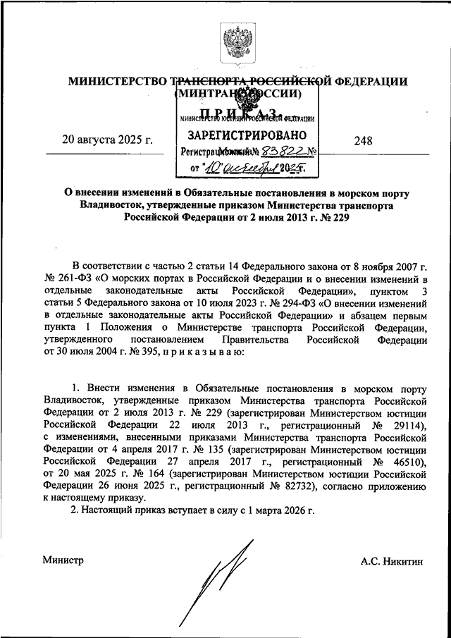 ПРИКАЗ Минтранса РФ от 20.08.2025 N 248