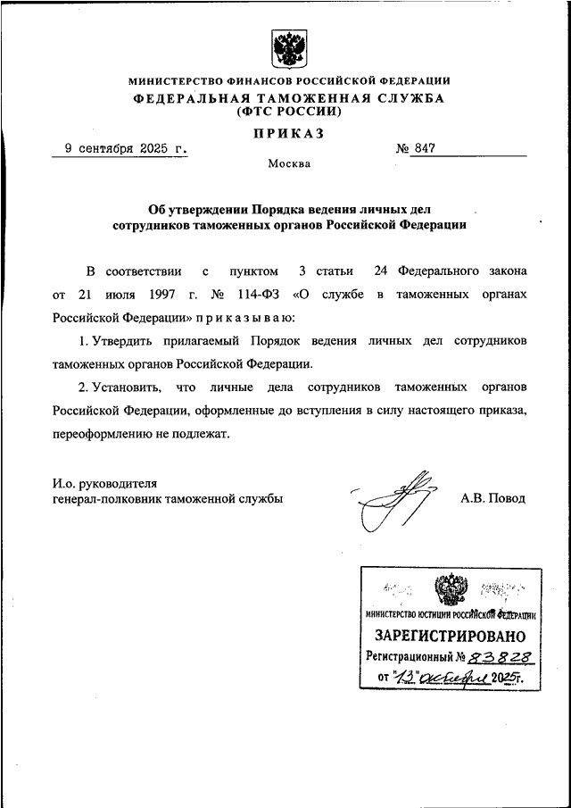 ПРИКАЗ ФТС РФ от 09.09.2025 N 847