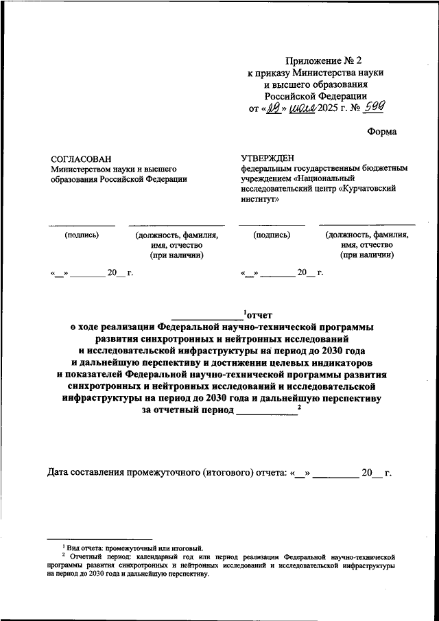 "ОБ УТВЕРЖДЕНИИ ПОРЯДКА ПОДГОТОВКИ ДЛЯ СОВЕТА ПО РЕАЛИЗАЦИИ ФЕДЕРАЛЬНОЙ НАУЧНО - ТЕХНИЧЕСКОЙ ПРОГРАММЫ РАЗВИТИЯ СИНХРОТРОННЫХ И НЕЙТРОННЫХ ИССЛЕДОВАНИЙ И ИССЛЕДОВАТЕЛЬСКОЙ ИНФРАСТРУКТУРЫ НА ПЕРИОД ДО 2030 ГОДА И ДАЛЬНЕЙШУЮ ПЕРСПЕКТИВУ ПРОМЕЖУТОЧНЫХ И ИТОГОВЫХ ОТЧЕТОВ О ХОДЕ РЕАЛИЗАЦИИ ФЕДЕРАЛЬНОЙ НАУЧНО - ТЕХНИЧЕСКОЙ ПРОГРАММЫ РАЗВИТИЯ СИНХРОТРОННЫХ И НЕЙТРОННЫХ ИССЛЕДОВАНИЙ И ИССЛЕДОВАТЕЛЬСКОЙ ИНФРАСТРУКТУРЫ НА ПЕРИОД ДО 2030 ГОДА И ДАЛЬНЕЙШУЮ ПЕРСПЕКТИВУ И ДОСТИЖЕНИИ ЦЕЛЕВЫХ ИНДИКАТОРОВ И ПОКАЗАТЕЛЕЙ ФЕДЕРАЛЬНОЙ НАУЧНО - ТЕХНИЧЕСКОЙ ПРОГРАММЫ РАЗВИТИЯ СИНХРОТРОННЫХ И НЕЙТРОННЫХ ИССЛЕДОВАНИЙ И ИССЛЕДОВАТЕЛЬСКОЙ ИНФРАСТРУКТУРЫ НА ПЕРИОД ДО 2030 ГОДА И ДАЛЬНЕЙШУЮ ПЕРСПЕКТИВУ И ИХ ФОРМЫ"