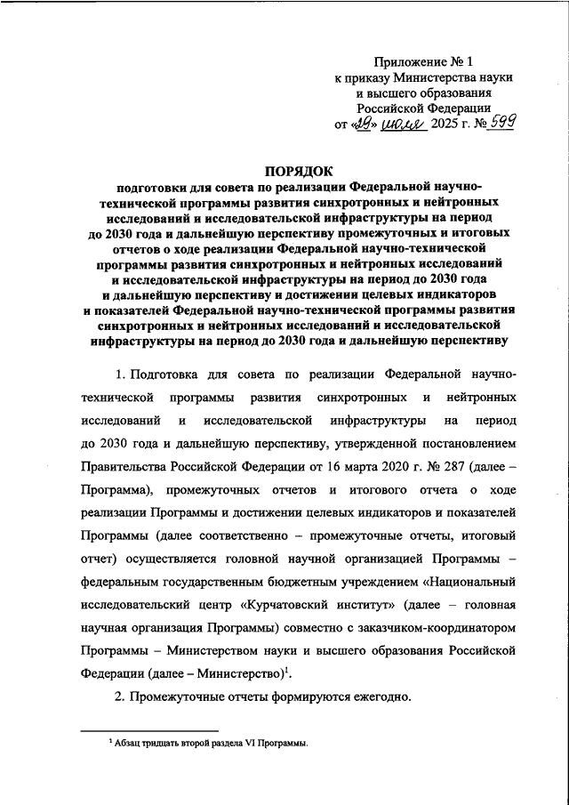 "ОБ УТВЕРЖДЕНИИ ПОРЯДКА ПОДГОТОВКИ ДЛЯ СОВЕТА ПО РЕАЛИЗАЦИИ ФЕДЕРАЛЬНОЙ НАУЧНО - ТЕХНИЧЕСКОЙ ПРОГРАММЫ РАЗВИТИЯ СИНХРОТРОННЫХ И НЕЙТРОННЫХ ИССЛЕДОВАНИЙ И ИССЛЕДОВАТЕЛЬСКОЙ ИНФРАСТРУКТУРЫ НА ПЕРИОД ДО 2030 ГОДА И ДАЛЬНЕЙШУЮ ПЕРСПЕКТИВУ ПРОМЕЖУТОЧНЫХ И ИТОГОВЫХ ОТЧЕТОВ О ХОДЕ РЕАЛИЗАЦИИ ФЕДЕРАЛЬНОЙ НАУЧНО - ТЕХНИЧЕСКОЙ ПРОГРАММЫ РАЗВИТИЯ СИНХРОТРОННЫХ И НЕЙТРОННЫХ ИССЛЕДОВАНИЙ И ИССЛЕДОВАТЕЛЬСКОЙ ИНФРАСТРУКТУРЫ НА ПЕРИОД ДО 2030 ГОДА И ДАЛЬНЕЙШУЮ ПЕРСПЕКТИВУ И ДОСТИЖЕНИИ ЦЕЛЕВЫХ ИНДИКАТОРОВ И ПОКАЗАТЕЛЕЙ ФЕДЕРАЛЬНОЙ НАУЧНО - ТЕХНИЧЕСКОЙ ПРОГРАММЫ РАЗВИТИЯ СИНХРОТРОННЫХ И НЕЙТРОННЫХ ИССЛЕДОВАНИЙ И ИССЛЕДОВАТЕЛЬСКОЙ ИНФРАСТРУКТУРЫ НА ПЕРИОД ДО 2030 ГОДА И ДАЛЬНЕЙШУЮ ПЕРСПЕКТИВУ И ИХ ФОРМЫ"