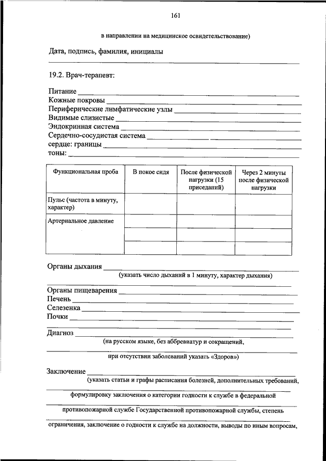 "ОБ УТВЕРЖДЕНИИ ТРЕБОВАНИЙ К СОСТОЯНИЮ ЗДОРОВЬЯ ГРАЖДАН, ПОСТУПАЮЩИХ НА СЛУЖБУ В ФЕДЕРАЛЬНУЮ ПРОТИВОПОЖАРНУЮ СЛУЖБУ ГОСУДАРСТВЕННОЙ ПРОТИВОПОЖАРНОЙ СЛУЖБЫ, СОТРУДНИКОВ ФЕДЕРАЛЬНОЙ ПРОТИВОПОЖАРНОЙ СЛУЖБЫ ГОСУДАРСТВЕННОЙ ПРОТИВОПОЖАРНОЙ СЛУЖБЫ, ПЕРЕЧНЯ ДОПОЛНИТЕЛЬНЫХ ОБЯЗАТЕЛЬНЫХ ДИАГНОСТИЧЕСКИХ ИССЛЕДОВАНИЙ, ПРОВОДИМЫХ ДО НАЧАЛА МЕДИЦИНСКОГО ОСВИДЕТЕЛЬСТВОВАНИЯ, ПОРЯДКА ПРОВЕДЕНИЯ КОНТРОЛЬНОГО ОБСЛЕДОВАНИЯ И ПОВТОРНОГО ОСВИДЕТЕЛЬСТВОВАНИЯ ПО РЕЗУЛЬТАТАМ НЕЗАВИСИМОЙ ВОЕННО - ВРАЧЕБНОЙ ЭКСПЕРТИЗЫ, ФОРМ ДОКУМЕНТАЦИИ (КРОМЕ УНИФИЦИРОВАННЫХ ФОРМ МЕДИЦИНСКОЙ ДОКУМЕНТАЦИИ), НЕОБХОДИМЫХ ДЛЯ ДЕЯТЕЛЬНОСТИ ВОЕННО - ВРАЧЕБНЫХ КОМИССИЙ, И ПРАВИЛ ИХ ЗАПОЛНЕНИЯ"