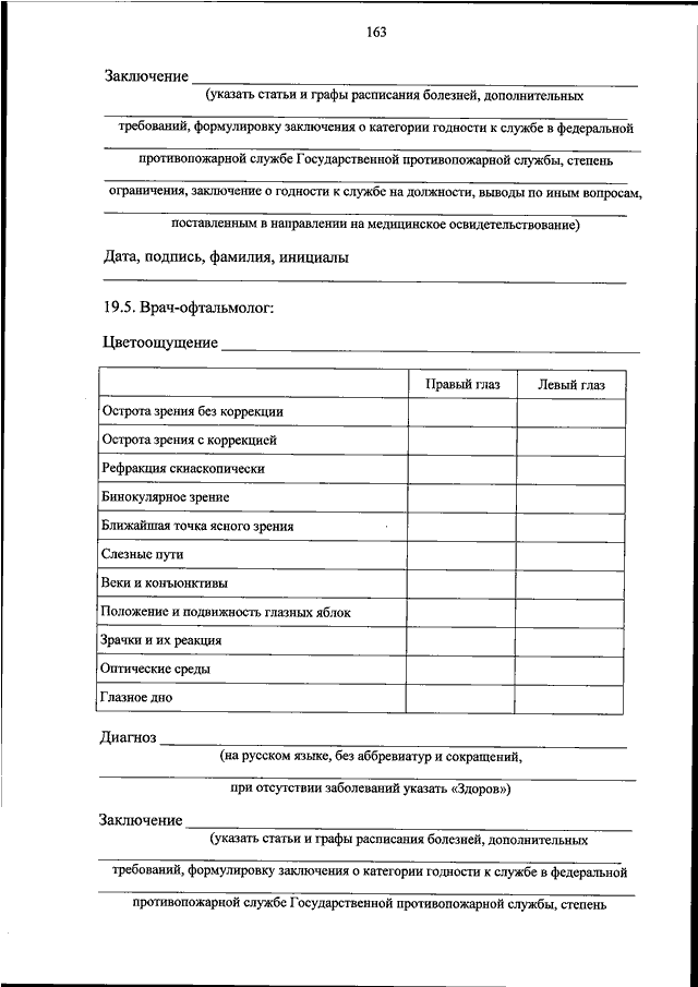 "ОБ УТВЕРЖДЕНИИ ТРЕБОВАНИЙ К СОСТОЯНИЮ ЗДОРОВЬЯ ГРАЖДАН, ПОСТУПАЮЩИХ НА СЛУЖБУ В ФЕДЕРАЛЬНУЮ ПРОТИВОПОЖАРНУЮ СЛУЖБУ ГОСУДАРСТВЕННОЙ ПРОТИВОПОЖАРНОЙ СЛУЖБЫ, СОТРУДНИКОВ ФЕДЕРАЛЬНОЙ ПРОТИВОПОЖАРНОЙ СЛУЖБЫ ГОСУДАРСТВЕННОЙ ПРОТИВОПОЖАРНОЙ СЛУЖБЫ, ПЕРЕЧНЯ ДОПОЛНИТЕЛЬНЫХ ОБЯЗАТЕЛЬНЫХ ДИАГНОСТИЧЕСКИХ ИССЛЕДОВАНИЙ, ПРОВОДИМЫХ ДО НАЧАЛА МЕДИЦИНСКОГО ОСВИДЕТЕЛЬСТВОВАНИЯ, ПОРЯДКА ПРОВЕДЕНИЯ КОНТРОЛЬНОГО ОБСЛЕДОВАНИЯ И ПОВТОРНОГО ОСВИДЕТЕЛЬСТВОВАНИЯ ПО РЕЗУЛЬТАТАМ НЕЗАВИСИМОЙ ВОЕННО - ВРАЧЕБНОЙ ЭКСПЕРТИЗЫ, ФОРМ ДОКУМЕНТАЦИИ (КРОМЕ УНИФИЦИРОВАННЫХ ФОРМ МЕДИЦИНСКОЙ ДОКУМЕНТАЦИИ), НЕОБХОДИМЫХ ДЛЯ ДЕЯТЕЛЬНОСТИ ВОЕННО - ВРАЧЕБНЫХ КОМИССИЙ, И ПРАВИЛ ИХ ЗАПОЛНЕНИЯ"