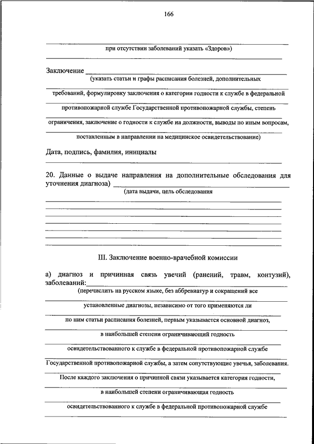 "ОБ УТВЕРЖДЕНИИ ТРЕБОВАНИЙ К СОСТОЯНИЮ ЗДОРОВЬЯ ГРАЖДАН, ПОСТУПАЮЩИХ НА СЛУЖБУ В ФЕДЕРАЛЬНУЮ ПРОТИВОПОЖАРНУЮ СЛУЖБУ ГОСУДАРСТВЕННОЙ ПРОТИВОПОЖАРНОЙ СЛУЖБЫ, СОТРУДНИКОВ ФЕДЕРАЛЬНОЙ ПРОТИВОПОЖАРНОЙ СЛУЖБЫ ГОСУДАРСТВЕННОЙ ПРОТИВОПОЖАРНОЙ СЛУЖБЫ, ПЕРЕЧНЯ ДОПОЛНИТЕЛЬНЫХ ОБЯЗАТЕЛЬНЫХ ДИАГНОСТИЧЕСКИХ ИССЛЕДОВАНИЙ, ПРОВОДИМЫХ ДО НАЧАЛА МЕДИЦИНСКОГО ОСВИДЕТЕЛЬСТВОВАНИЯ, ПОРЯДКА ПРОВЕДЕНИЯ КОНТРОЛЬНОГО ОБСЛЕДОВАНИЯ И ПОВТОРНОГО ОСВИДЕТЕЛЬСТВОВАНИЯ ПО РЕЗУЛЬТАТАМ НЕЗАВИСИМОЙ ВОЕННО - ВРАЧЕБНОЙ ЭКСПЕРТИЗЫ, ФОРМ ДОКУМЕНТАЦИИ (КРОМЕ УНИФИЦИРОВАННЫХ ФОРМ МЕДИЦИНСКОЙ ДОКУМЕНТАЦИИ), НЕОБХОДИМЫХ ДЛЯ ДЕЯТЕЛЬНОСТИ ВОЕННО - ВРАЧЕБНЫХ КОМИССИЙ, И ПРАВИЛ ИХ ЗАПОЛНЕНИЯ"