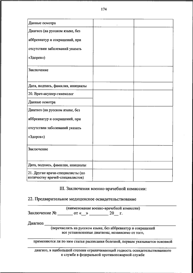 "ОБ УТВЕРЖДЕНИИ ТРЕБОВАНИЙ К СОСТОЯНИЮ ЗДОРОВЬЯ ГРАЖДАН, ПОСТУПАЮЩИХ НА СЛУЖБУ В ФЕДЕРАЛЬНУЮ ПРОТИВОПОЖАРНУЮ СЛУЖБУ ГОСУДАРСТВЕННОЙ ПРОТИВОПОЖАРНОЙ СЛУЖБЫ, СОТРУДНИКОВ ФЕДЕРАЛЬНОЙ ПРОТИВОПОЖАРНОЙ СЛУЖБЫ ГОСУДАРСТВЕННОЙ ПРОТИВОПОЖАРНОЙ СЛУЖБЫ, ПЕРЕЧНЯ ДОПОЛНИТЕЛЬНЫХ ОБЯЗАТЕЛЬНЫХ ДИАГНОСТИЧЕСКИХ ИССЛЕДОВАНИЙ, ПРОВОДИМЫХ ДО НАЧАЛА МЕДИЦИНСКОГО ОСВИДЕТЕЛЬСТВОВАНИЯ, ПОРЯДКА ПРОВЕДЕНИЯ КОНТРОЛЬНОГО ОБСЛЕДОВАНИЯ И ПОВТОРНОГО ОСВИДЕТЕЛЬСТВОВАНИЯ ПО РЕЗУЛЬТАТАМ НЕЗАВИСИМОЙ ВОЕННО - ВРАЧЕБНОЙ ЭКСПЕРТИЗЫ, ФОРМ ДОКУМЕНТАЦИИ (КРОМЕ УНИФИЦИРОВАННЫХ ФОРМ МЕДИЦИНСКОЙ ДОКУМЕНТАЦИИ), НЕОБХОДИМЫХ ДЛЯ ДЕЯТЕЛЬНОСТИ ВОЕННО - ВРАЧЕБНЫХ КОМИССИЙ, И ПРАВИЛ ИХ ЗАПОЛНЕНИЯ"