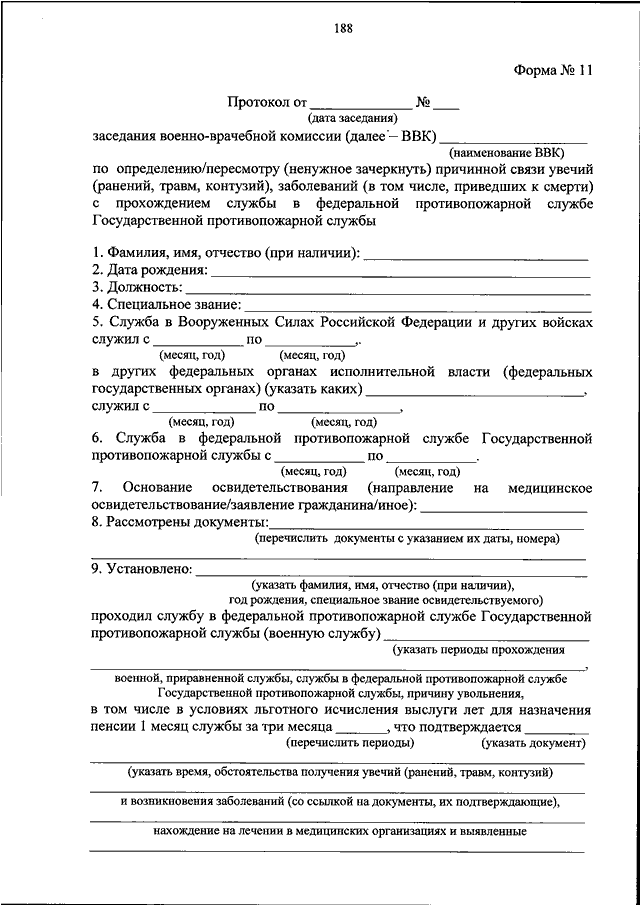 "ОБ УТВЕРЖДЕНИИ ТРЕБОВАНИЙ К СОСТОЯНИЮ ЗДОРОВЬЯ ГРАЖДАН, ПОСТУПАЮЩИХ НА СЛУЖБУ В ФЕДЕРАЛЬНУЮ ПРОТИВОПОЖАРНУЮ СЛУЖБУ ГОСУДАРСТВЕННОЙ ПРОТИВОПОЖАРНОЙ СЛУЖБЫ, СОТРУДНИКОВ ФЕДЕРАЛЬНОЙ ПРОТИВОПОЖАРНОЙ СЛУЖБЫ ГОСУДАРСТВЕННОЙ ПРОТИВОПОЖАРНОЙ СЛУЖБЫ, ПЕРЕЧНЯ ДОПОЛНИТЕЛЬНЫХ ОБЯЗАТЕЛЬНЫХ ДИАГНОСТИЧЕСКИХ ИССЛЕДОВАНИЙ, ПРОВОДИМЫХ ДО НАЧАЛА МЕДИЦИНСКОГО ОСВИДЕТЕЛЬСТВОВАНИЯ, ПОРЯДКА ПРОВЕДЕНИЯ КОНТРОЛЬНОГО ОБСЛЕДОВАНИЯ И ПОВТОРНОГО ОСВИДЕТЕЛЬСТВОВАНИЯ ПО РЕЗУЛЬТАТАМ НЕЗАВИСИМОЙ ВОЕННО - ВРАЧЕБНОЙ ЭКСПЕРТИЗЫ, ФОРМ ДОКУМЕНТАЦИИ (КРОМЕ УНИФИЦИРОВАННЫХ ФОРМ МЕДИЦИНСКОЙ ДОКУМЕНТАЦИИ), НЕОБХОДИМЫХ ДЛЯ ДЕЯТЕЛЬНОСТИ ВОЕННО - ВРАЧЕБНЫХ КОМИССИЙ, И ПРАВИЛ ИХ ЗАПОЛНЕНИЯ"