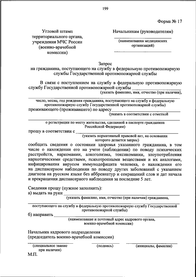 "ОБ УТВЕРЖДЕНИИ ТРЕБОВАНИЙ К СОСТОЯНИЮ ЗДОРОВЬЯ ГРАЖДАН, ПОСТУПАЮЩИХ НА СЛУЖБУ В ФЕДЕРАЛЬНУЮ ПРОТИВОПОЖАРНУЮ СЛУЖБУ ГОСУДАРСТВЕННОЙ ПРОТИВОПОЖАРНОЙ СЛУЖБЫ, СОТРУДНИКОВ ФЕДЕРАЛЬНОЙ ПРОТИВОПОЖАРНОЙ СЛУЖБЫ ГОСУДАРСТВЕННОЙ ПРОТИВОПОЖАРНОЙ СЛУЖБЫ, ПЕРЕЧНЯ ДОПОЛНИТЕЛЬНЫХ ОБЯЗАТЕЛЬНЫХ ДИАГНОСТИЧЕСКИХ ИССЛЕДОВАНИЙ, ПРОВОДИМЫХ ДО НАЧАЛА МЕДИЦИНСКОГО ОСВИДЕТЕЛЬСТВОВАНИЯ, ПОРЯДКА ПРОВЕДЕНИЯ КОНТРОЛЬНОГО ОБСЛЕДОВАНИЯ И ПОВТОРНОГО ОСВИДЕТЕЛЬСТВОВАНИЯ ПО РЕЗУЛЬТАТАМ НЕЗАВИСИМОЙ ВОЕННО - ВРАЧЕБНОЙ ЭКСПЕРТИЗЫ, ФОРМ ДОКУМЕНТАЦИИ (КРОМЕ УНИФИЦИРОВАННЫХ ФОРМ МЕДИЦИНСКОЙ ДОКУМЕНТАЦИИ), НЕОБХОДИМЫХ ДЛЯ ДЕЯТЕЛЬНОСТИ ВОЕННО - ВРАЧЕБНЫХ КОМИССИЙ, И ПРАВИЛ ИХ ЗАПОЛНЕНИЯ"