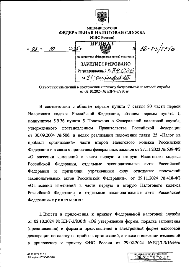 ПРИКАЗ ФНС РФ от 03.10.2025 N ЕД-7-3/855@