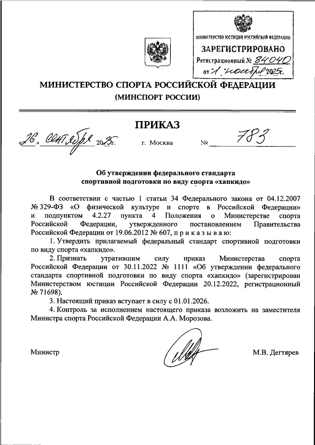 ПРИКАЗ Минспорта РФ от 26.09.2025 N 783