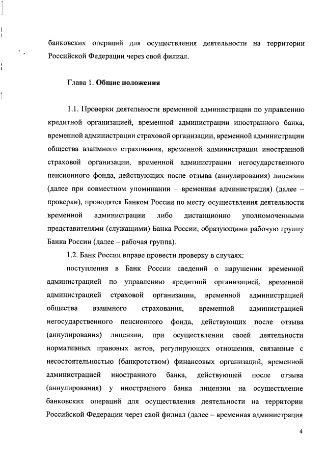 "О СЛУЧАЯХ И ПОРЯДКЕ ПРОВЕДЕНИЯ БАНКОМ РОССИИ ПРОВЕРОК ДЕЯТЕЛЬНОСТИ ВРЕМЕННОЙ АДМИНИСТРАЦИИ ПО УПРАВЛЕНИЮ КРЕДИТНОЙ ОРГАНИЗАЦИЕЙ, ВРЕМЕННОЙ АДМИНИСТРАЦИИ ИНОСТРАННОГО БАНКА, ВРЕМЕННОЙ АДМИНИСТРАЦИИ СТРАХОВОЙ ОРГАНИЗАЦИИ, ВРЕМЕННОЙ АДМИНИСТРАЦИИ ОБЩЕСТВА ВЗАИМНОГО СТРАХОВАНИЯ, ВРЕМЕННОЙ АДМИНИСТРАЦИИ ИНОСТРАННОЙ СТРАХОВОЙ ОРГАНИЗАЦИИ, ВРЕМЕННОЙ АДМИНИСТРАЦИИ НЕГОСУДАРСТВЕННОГО ПЕНСИОННОГО ФОНДА, ДЕЙСТВУЮЩИХ ПОСЛЕ ОТЗЫВА (АННУЛИРОВАНИЯ) ЛИЦЕНЗИИ, И НАПРАВЛЕНИЯ БАНКОМ РОССИИ ПРЕДПИСАНИЯ ОБ УСТРАНЕНИИ НАРУШЕНИЙ, ВЫЯВЛЕННЫХ БАНКОМ РОССИИ В ХОДЕ ПРОВЕРКИ ДЕЯТЕЛЬНОСТИ ВРЕМЕННОЙ АДМИНИСТРАЦИИ ПО УПРАВЛЕНИЮ КРЕДИТНОЙ ОРГАНИЗАЦИЕЙ, ВРЕМЕННОЙ АДМИНИСТРАЦИИ ИНОСТРАННОГО БАНКА, ВРЕМЕННОЙ АДМИНИСТРАЦИИ СТРАХОВОЙ ОРГАНИЗАЦИИ, ВРЕМЕННОЙ АДМИНИСТРАЦИИ ОБЩЕСТВА ВЗАИМНОГО СТРАХОВАНИЯ, ВРЕМЕННОЙ АДМИНИСТРАЦИИ НЕГОСУДАРСТВЕННОГО ПЕНСИОННОГО ФОНДА, ДЕЙСТВУЮЩИХ ПОСЛЕ ОТЗЫВА (АННУЛИРОВАНИЯ) ЛИЦЕНЗИИ, А ТАКЖЕ О ПОРЯДКЕ НАПРАВЛЕНИЯ БАНКОМ РОССИИ ТРЕБОВАНИЯ О ЗАМЕНЕ ПРЕДСТАВИТЕЛЯ ГОСУДАРСТВЕННОЙ КОРПОРАЦИИ "АГЕНТСТВО ПО СТРАХОВАНИЮ ВКЛАДОВ" ВО ВРЕМЕННОЙ АДМИНИСТРАЦИИ ИНОСТРАННОГО БАНКА"