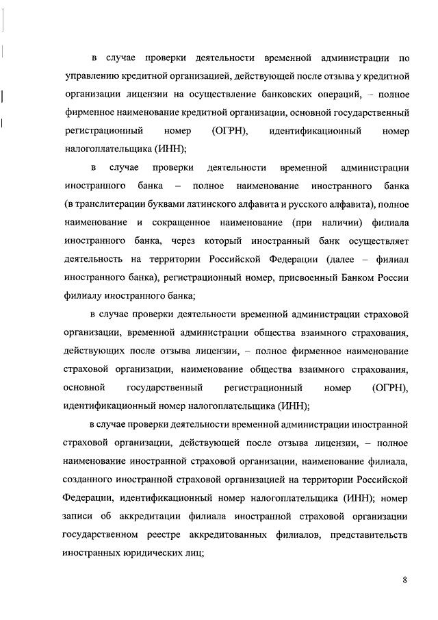 "О СЛУЧАЯХ И ПОРЯДКЕ ПРОВЕДЕНИЯ БАНКОМ РОССИИ ПРОВЕРОК ДЕЯТЕЛЬНОСТИ ВРЕМЕННОЙ АДМИНИСТРАЦИИ ПО УПРАВЛЕНИЮ КРЕДИТНОЙ ОРГАНИЗАЦИЕЙ, ВРЕМЕННОЙ АДМИНИСТРАЦИИ ИНОСТРАННОГО БАНКА, ВРЕМЕННОЙ АДМИНИСТРАЦИИ СТРАХОВОЙ ОРГАНИЗАЦИИ, ВРЕМЕННОЙ АДМИНИСТРАЦИИ ОБЩЕСТВА ВЗАИМНОГО СТРАХОВАНИЯ, ВРЕМЕННОЙ АДМИНИСТРАЦИИ ИНОСТРАННОЙ СТРАХОВОЙ ОРГАНИЗАЦИИ, ВРЕМЕННОЙ АДМИНИСТРАЦИИ НЕГОСУДАРСТВЕННОГО ПЕНСИОННОГО ФОНДА, ДЕЙСТВУЮЩИХ ПОСЛЕ ОТЗЫВА (АННУЛИРОВАНИЯ) ЛИЦЕНЗИИ, И НАПРАВЛЕНИЯ БАНКОМ РОССИИ ПРЕДПИСАНИЯ ОБ УСТРАНЕНИИ НАРУШЕНИЙ, ВЫЯВЛЕННЫХ БАНКОМ РОССИИ В ХОДЕ ПРОВЕРКИ ДЕЯТЕЛЬНОСТИ ВРЕМЕННОЙ АДМИНИСТРАЦИИ ПО УПРАВЛЕНИЮ КРЕДИТНОЙ ОРГАНИЗАЦИЕЙ, ВРЕМЕННОЙ АДМИНИСТРАЦИИ ИНОСТРАННОГО БАНКА, ВРЕМЕННОЙ АДМИНИСТРАЦИИ СТРАХОВОЙ ОРГАНИЗАЦИИ, ВРЕМЕННОЙ АДМИНИСТРАЦИИ ОБЩЕСТВА ВЗАИМНОГО СТРАХОВАНИЯ, ВРЕМЕННОЙ АДМИНИСТРАЦИИ НЕГОСУДАРСТВЕННОГО ПЕНСИОННОГО ФОНДА, ДЕЙСТВУЮЩИХ ПОСЛЕ ОТЗЫВА (АННУЛИРОВАНИЯ) ЛИЦЕНЗИИ, А ТАКЖЕ О ПОРЯДКЕ НАПРАВЛЕНИЯ БАНКОМ РОССИИ ТРЕБОВАНИЯ О ЗАМЕНЕ ПРЕДСТАВИТЕЛЯ ГОСУДАРСТВЕННОЙ КОРПОРАЦИИ "АГЕНТСТВО ПО СТРАХОВАНИЮ ВКЛАДОВ" ВО ВРЕМЕННОЙ АДМИНИСТРАЦИИ ИНОСТРАННОГО БАНКА"