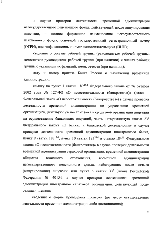 "О СЛУЧАЯХ И ПОРЯДКЕ ПРОВЕДЕНИЯ БАНКОМ РОССИИ ПРОВЕРОК ДЕЯТЕЛЬНОСТИ ВРЕМЕННОЙ АДМИНИСТРАЦИИ ПО УПРАВЛЕНИЮ КРЕДИТНОЙ ОРГАНИЗАЦИЕЙ, ВРЕМЕННОЙ АДМИНИСТРАЦИИ ИНОСТРАННОГО БАНКА, ВРЕМЕННОЙ АДМИНИСТРАЦИИ СТРАХОВОЙ ОРГАНИЗАЦИИ, ВРЕМЕННОЙ АДМИНИСТРАЦИИ ОБЩЕСТВА ВЗАИМНОГО СТРАХОВАНИЯ, ВРЕМЕННОЙ АДМИНИСТРАЦИИ ИНОСТРАННОЙ СТРАХОВОЙ ОРГАНИЗАЦИИ, ВРЕМЕННОЙ АДМИНИСТРАЦИИ НЕГОСУДАРСТВЕННОГО ПЕНСИОННОГО ФОНДА, ДЕЙСТВУЮЩИХ ПОСЛЕ ОТЗЫВА (АННУЛИРОВАНИЯ) ЛИЦЕНЗИИ, И НАПРАВЛЕНИЯ БАНКОМ РОССИИ ПРЕДПИСАНИЯ ОБ УСТРАНЕНИИ НАРУШЕНИЙ, ВЫЯВЛЕННЫХ БАНКОМ РОССИИ В ХОДЕ ПРОВЕРКИ ДЕЯТЕЛЬНОСТИ ВРЕМЕННОЙ АДМИНИСТРАЦИИ ПО УПРАВЛЕНИЮ КРЕДИТНОЙ ОРГАНИЗАЦИЕЙ, ВРЕМЕННОЙ АДМИНИСТРАЦИИ ИНОСТРАННОГО БАНКА, ВРЕМЕННОЙ АДМИНИСТРАЦИИ СТРАХОВОЙ ОРГАНИЗАЦИИ, ВРЕМЕННОЙ АДМИНИСТРАЦИИ ОБЩЕСТВА ВЗАИМНОГО СТРАХОВАНИЯ, ВРЕМЕННОЙ АДМИНИСТРАЦИИ НЕГОСУДАРСТВЕННОГО ПЕНСИОННОГО ФОНДА, ДЕЙСТВУЮЩИХ ПОСЛЕ ОТЗЫВА (АННУЛИРОВАНИЯ) ЛИЦЕНЗИИ, А ТАКЖЕ О ПОРЯДКЕ НАПРАВЛЕНИЯ БАНКОМ РОССИИ ТРЕБОВАНИЯ О ЗАМЕНЕ ПРЕДСТАВИТЕЛЯ ГОСУДАРСТВЕННОЙ КОРПОРАЦИИ "АГЕНТСТВО ПО СТРАХОВАНИЮ ВКЛАДОВ" ВО ВРЕМЕННОЙ АДМИНИСТРАЦИИ ИНОСТРАННОГО БАНКА"