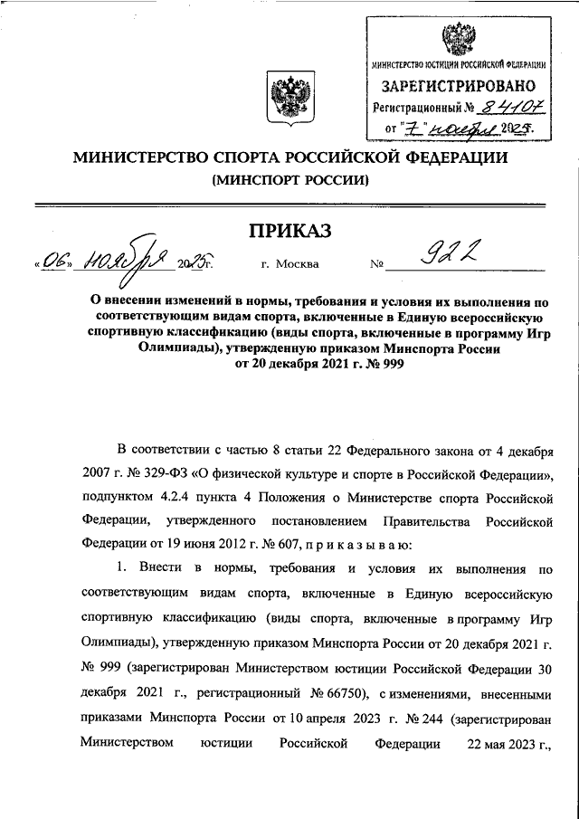 ПРИКАЗ Минспорта РФ от 06.11.2025 N 922