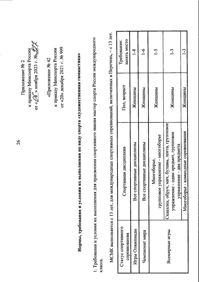 "О ВНЕСЕНИИ ИЗМЕНЕНИЙ В НОРМЫ, ТРЕБОВАНИЯ И УСЛОВИЯ ИХ ВЫПОЛНЕНИЯ ПО СООТВЕТСТВУЮЩИМ ВИДАМ СПОРТА, ВКЛЮЧЕННЫЕ В ЕДИНУЮ ВСЕРОССИЙСКУЮ СПОРТИВНУЮ КЛАССИФИКАЦИЮ (ВИДЫ СПОРТА, ВКЛЮЧЕННЫЕ В ПРОГРАММУ ИГР ОЛИМПИАДЫ), УТВЕРЖДЕННУЮ ПРИКАЗОМ МИНСПОРТА РОССИИ ОТ 20 ДЕКАБРЯ 2021 Г. N 999"