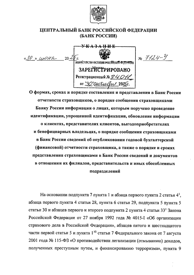 УКАЗАНИЕ ЦБ РФ от 30.06.2025 N 7124-У