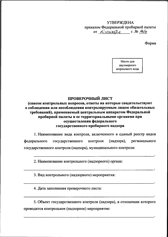 "ОБ УТВЕРЖДЕНИИ ФОРМЫ ПРОВЕРОЧНОГО ЛИСТА (СПИСКА КОНТРОЛЬНЫХ ВОПРОСОВ, ОТВЕТЫ НА КОТОРЫЕ СВИДЕТЕЛЬСТВУЮТ О СОБЛЮДЕНИИ ИЛИ НЕСОБЛЮДЕНИИ КОНТРОЛИРУЕМЫМ ЛИЦОМ ОБЯЗАТЕЛЬНЫХ ТРЕБОВАНИЙ), ПРИМЕНЯЕМОГО ЦЕНТРАЛЬНЫМ АППАРАТОМ ФЕДЕРАЛЬНОЙ ПРОБИРНОЙ ПАЛАТЫ И ЕЕ ТЕРРИТОРИАЛЬНЫМИ ОРГАНАМИ ПРИ ОСУЩЕСТВЛЕНИИ ФЕДЕРАЛЬНОГО ГОСУДАРСТВЕННОГО ПРОБИРНОГО НАДЗОРА"