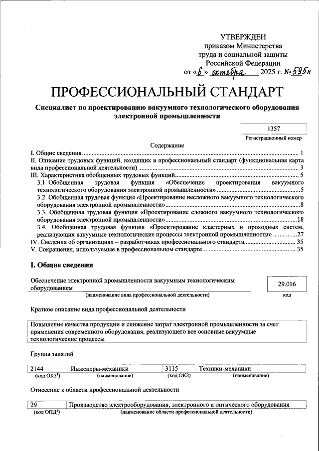 "ОБ УТВЕРЖДЕНИИ ПРОФЕССИОНАЛЬНОГО СТАНДАРТА "СПЕЦИАЛИСТ ПО ПРОЕКТИРОВАНИЮ ВАКУУМНОГО ТЕХНОЛОГИЧЕСКОГО ОБОРУДОВАНИЯ ЭЛЕКТРОННОЙ ПРОМЫШЛЕННОСТИ"
