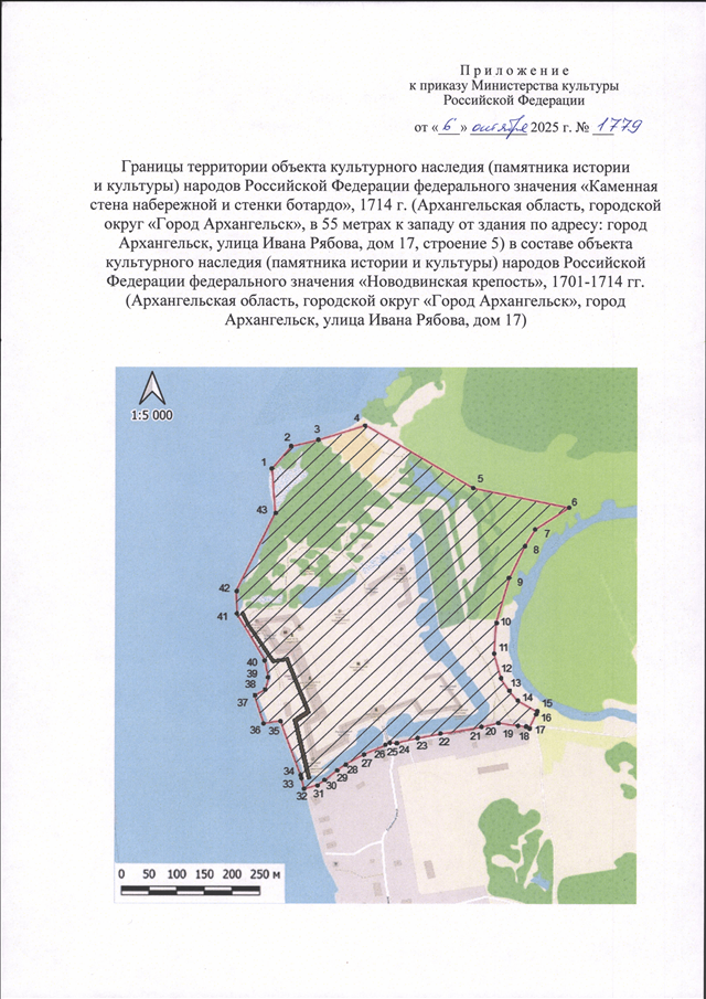 "О ВКЛЮЧЕНИИ ВЫЯВЛЕННОГО ОБЪЕКТА КУЛЬТУРНОГО НАСЛЕДИЯ (ПАМЯТНИКА ИСТОРИИ И КУЛЬТУРЫ) НАРОДОВ РОССИЙСКОЙ ФЕДЕРАЦИИ "КАМЕННАЯ СТЕНА НАБЕРЕЖНОЙ И СТЕНКИ БОТАРДО", 1714 Г. (АРХАНГЕЛЬСКАЯ ОБЛАСТЬ, ГОРОДСКОЙ ОКРУГ "ГОРОД АРХАНГЕЛЬСК", В 55 МЕТРАХ К ЗАПАДУ ОТ ЗДАНИЯ ПО АДРЕСУ: ГОРОД АРХАНГЕЛЬСК, УЛИЦА ИВАНА РЯБОВА, ДОМ 17, СТРОЕНИЕ 5) В ЕДИНЫЙ ГОСУДАРСТВЕННЫЙ РЕЕСТР ОБЪЕКТОВ КУЛЬТУРНОГО НАСЛЕДИЯ (ПАМЯТНИКОВ ИСТОРИИ И КУЛЬТУРЫ) НАРОДОВ РОССИЙСКОЙ ФЕДЕРАЦИИ В СОСТАВЕ ОБЪЕКТА КУЛЬТУРНОГО НАСЛЕДИЯ (ПАМЯТНИКА ИСТОРИИ И КУЛЬТУРЫ) НАРОДОВ РОССИЙСКОЙ ФЕДЕРАЦИИ ФЕДЕРАЛЬНОГО ЗНАЧЕНИЯ "НОВОДВИНСКАЯ КРЕПОСТЬ", 1701 - 1714 ГГ. (АРХАНГЕЛЬСКАЯ ОБЛАСТЬ, ГОРОДСКОЙ ОКРУГ "ГОРОД АРХАНГЕЛЬСК", ГОРОД АРХАНГЕЛЬСК, УЛИЦА ИВАНА РЯБОВА, ДОМ 17) В КАЧЕСТВЕ ОБЪЕКТА КУЛЬТУРНОГО НАСЛЕДИЯ (ПАМЯТНИКА ИСТОРИИ И КУЛЬТУРЫ) НАРОДОВ РОССИЙСКОЙ ФЕДЕРАЦИИ ФЕДЕРАЛЬНОГО ЗНАЧЕНИЯ И УТВЕРЖДЕНИИ ГРАНИЦ ЕГО ТЕРРИТОРИИ"