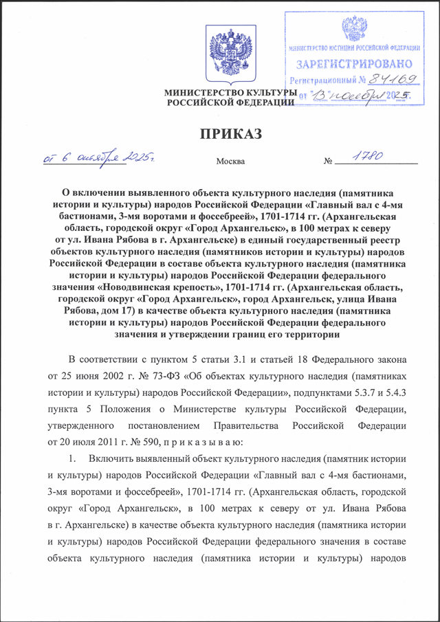 "О ВКЛЮЧЕНИИ ВЫЯВЛЕННОГО ОБЪЕКТА КУЛЬТУРНОГО НАСЛЕДИЯ (ПАМЯТНИКА ИСТОРИИ И КУЛЬТУРЫ) НАРОДОВ РОССИЙСКОЙ ФЕДЕРАЦИИ "ГЛАВНЫЙ ВАЛ С 4-МЯ БАСТИОНАМИ, 3-МЯ ВОРОТАМИ И ФОССЕБРЕЕЙ", 1701 - 1714 ГГ. (АРХАНГЕЛЬСКАЯ ОБЛАСТЬ, ГОРОДСКОЙ ОКРУГ "ГОРОД АРХАНГЕЛЬСК", В 100 МЕТРАХ К СЕВЕРУ ОТ УЛ. ИВАНА РЯБОВА В Г. АРХАНГЕЛЬСКЕ) В ЕДИНЫЙ ГОСУДАРСТВЕННЫЙ РЕЕСТР ОБЪЕКТОВ КУЛЬТУРНОГО НАСЛЕДИЯ (ПАМЯТНИКОВ ИСТОРИИ И КУЛЬТУРЫ) НАРОДОВ РОССИЙСКОЙ ФЕДЕРАЦИИ В СОСТАВЕ ОБЪЕКТА КУЛЬТУРНОГО НАСЛЕДИЯ (ПАМЯТНИКА ИСТОРИИ И КУЛЬТУРЫ) НАРОДОВ РОССИЙСКОЙ ФЕДЕРАЦИИ ФЕДЕРАЛЬНОГО ЗНАЧЕНИЯ "НОВОДВИНСКАЯ КРЕПОСТЬ", 1701 - 1714 ГГ. (АРХАНГЕЛЬСКАЯ ОБЛАСТЬ, ГОРОДСКОЙ ОКРУГ "ГОРОД АРХАНГЕЛЬСК", ГОРОД АРХАНГЕЛЬСК, УЛИЦА ИВАНА РЯБОВА, ДОМ 17) В КАЧЕСТВЕ ОБЪЕКТА КУЛЬТУРНОГО НАСЛЕДИЯ (ПАМЯТНИКА ИСТОРИИ И КУЛЬТУРЫ) НАРОДОВ РОССИЙСКОЙ ФЕДЕРАЦИИ ФЕДЕРАЛЬНОГО ЗНАЧЕНИЯ И УТВЕРЖДЕНИИ ГРАНИЦ ЕГО ТЕРРИТОРИИ"