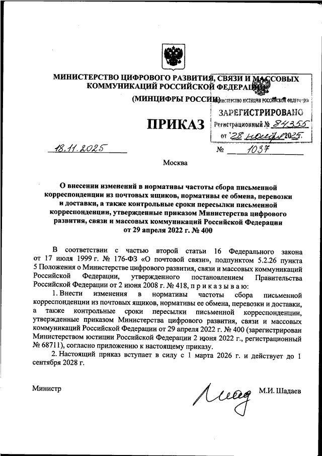 ПРИКАЗ Минцифры России от 18.11.2025 N 1037