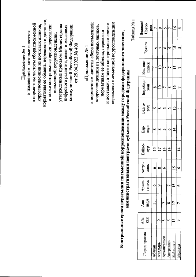 "О ВНЕСЕНИИ ИЗМЕНЕНИЙ В НОРМАТИВЫ ЧАСТОТЫ СБОРА ПИСЬМЕННОЙ КОРРЕСПОНДЕНЦИИ ИЗ ПОЧТОВЫХ ЯЩИКОВ, НОРМАТИВЫ ЕЕ ОБМЕНА, ПЕРЕВОЗКИ И ДОСТАВКИ, А ТАКЖЕ КОНТРОЛЬНЫЕ СРОКИ ПЕРЕСЫЛКИ ПИСЬМЕННОЙ КОРРЕСПОНДЕНЦИИ, УТВЕРЖДЕННЫЕ ПРИКАЗОМ МИНИСТЕРСТВА ЦИФРОВОГО РАЗВИТИЯ, СВЯЗИ И МАССОВЫХ КОММУНИКАЦИЙ РОССИЙСКОЙ ФЕДЕРАЦИИ ОТ 29 АПРЕЛЯ 2022 Г. N 400"