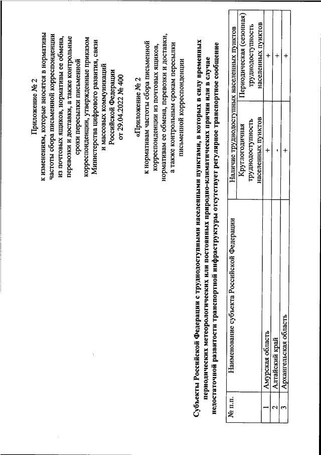 "О ВНЕСЕНИИ ИЗМЕНЕНИЙ В НОРМАТИВЫ ЧАСТОТЫ СБОРА ПИСЬМЕННОЙ КОРРЕСПОНДЕНЦИИ ИЗ ПОЧТОВЫХ ЯЩИКОВ, НОРМАТИВЫ ЕЕ ОБМЕНА, ПЕРЕВОЗКИ И ДОСТАВКИ, А ТАКЖЕ КОНТРОЛЬНЫЕ СРОКИ ПЕРЕСЫЛКИ ПИСЬМЕННОЙ КОРРЕСПОНДЕНЦИИ, УТВЕРЖДЕННЫЕ ПРИКАЗОМ МИНИСТЕРСТВА ЦИФРОВОГО РАЗВИТИЯ, СВЯЗИ И МАССОВЫХ КОММУНИКАЦИЙ РОССИЙСКОЙ ФЕДЕРАЦИИ ОТ 29 АПРЕЛЯ 2022 Г. N 400"