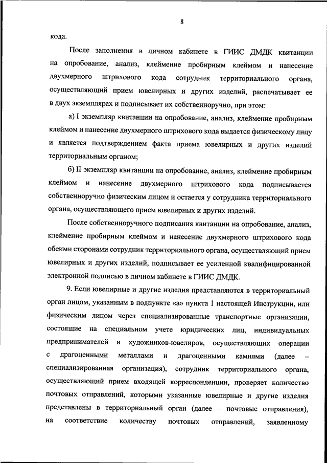 "ОБ УТВЕРЖДЕНИИ ИНСТРУКЦИИ ПО ОПРОБОВАНИЮ, АНАЛИЗУ, КЛЕЙМЕНИЮ ЮВЕЛИРНЫХ И ДРУГИХ ИЗДЕЛИЙ ИЗ ДРАГОЦЕННЫХ МЕТАЛЛОВ, НАНЕСЕНИЮ ДВУХМЕРНОГО ШТРИХОВОГО КОДА НЕПОСРЕДСТВЕННО НА ЮВЕЛИРНЫЕ И ДРУГИЕ ИЗДЕЛИЯ ИЗ ДРАГОЦЕННЫХ МЕТАЛЛОВ, ПРИЕМУ, ХРАНЕНИЮ, ВЫДАЧЕ ЮВЕЛИРНЫХ И ДРУГИХ ИЗДЕЛИЙ ИЗ ДРАГОЦЕННЫХ МЕТАЛЛОВ, АНАЛИЗУ МАТЕРИАЛОВ, СОДЕРЖАЩИХ ДРАГОЦЕННЫЕ МЕТАЛЛЫ, ИЗГОТОВЛЕНИЮ ПРОБИРНЫХ РЕАКТИВОВ И ФОРМ КВИТАНЦИЙ"