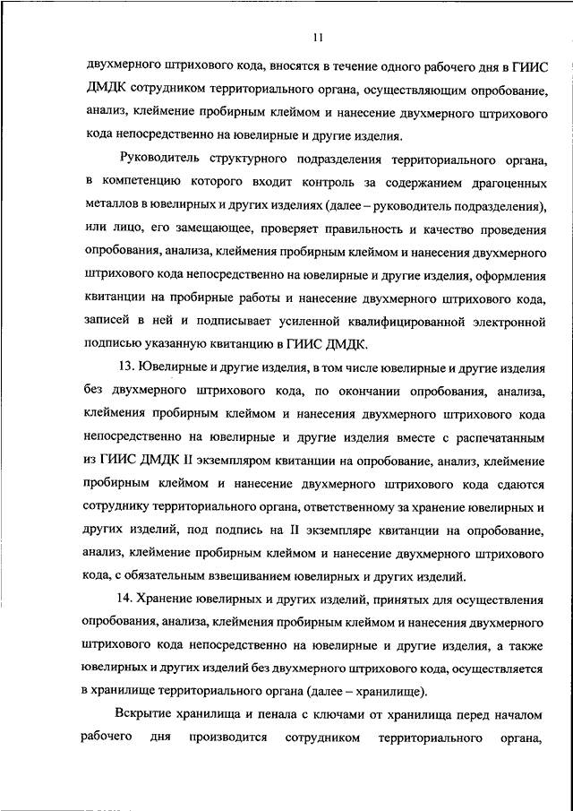"ОБ УТВЕРЖДЕНИИ ИНСТРУКЦИИ ПО ОПРОБОВАНИЮ, АНАЛИЗУ, КЛЕЙМЕНИЮ ЮВЕЛИРНЫХ И ДРУГИХ ИЗДЕЛИЙ ИЗ ДРАГОЦЕННЫХ МЕТАЛЛОВ, НАНЕСЕНИЮ ДВУХМЕРНОГО ШТРИХОВОГО КОДА НЕПОСРЕДСТВЕННО НА ЮВЕЛИРНЫЕ И ДРУГИЕ ИЗДЕЛИЯ ИЗ ДРАГОЦЕННЫХ МЕТАЛЛОВ, ПРИЕМУ, ХРАНЕНИЮ, ВЫДАЧЕ ЮВЕЛИРНЫХ И ДРУГИХ ИЗДЕЛИЙ ИЗ ДРАГОЦЕННЫХ МЕТАЛЛОВ, АНАЛИЗУ МАТЕРИАЛОВ, СОДЕРЖАЩИХ ДРАГОЦЕННЫЕ МЕТАЛЛЫ, ИЗГОТОВЛЕНИЮ ПРОБИРНЫХ РЕАКТИВОВ И ФОРМ КВИТАНЦИЙ"