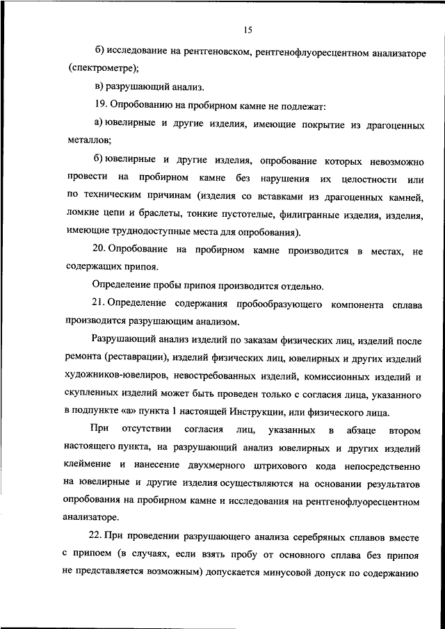 "ОБ УТВЕРЖДЕНИИ ИНСТРУКЦИИ ПО ОПРОБОВАНИЮ, АНАЛИЗУ, КЛЕЙМЕНИЮ ЮВЕЛИРНЫХ И ДРУГИХ ИЗДЕЛИЙ ИЗ ДРАГОЦЕННЫХ МЕТАЛЛОВ, НАНЕСЕНИЮ ДВУХМЕРНОГО ШТРИХОВОГО КОДА НЕПОСРЕДСТВЕННО НА ЮВЕЛИРНЫЕ И ДРУГИЕ ИЗДЕЛИЯ ИЗ ДРАГОЦЕННЫХ МЕТАЛЛОВ, ПРИЕМУ, ХРАНЕНИЮ, ВЫДАЧЕ ЮВЕЛИРНЫХ И ДРУГИХ ИЗДЕЛИЙ ИЗ ДРАГОЦЕННЫХ МЕТАЛЛОВ, АНАЛИЗУ МАТЕРИАЛОВ, СОДЕРЖАЩИХ ДРАГОЦЕННЫЕ МЕТАЛЛЫ, ИЗГОТОВЛЕНИЮ ПРОБИРНЫХ РЕАКТИВОВ И ФОРМ КВИТАНЦИЙ"
