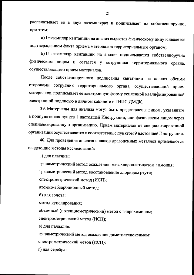 "ОБ УТВЕРЖДЕНИИ ИНСТРУКЦИИ ПО ОПРОБОВАНИЮ, АНАЛИЗУ, КЛЕЙМЕНИЮ ЮВЕЛИРНЫХ И ДРУГИХ ИЗДЕЛИЙ ИЗ ДРАГОЦЕННЫХ МЕТАЛЛОВ, НАНЕСЕНИЮ ДВУХМЕРНОГО ШТРИХОВОГО КОДА НЕПОСРЕДСТВЕННО НА ЮВЕЛИРНЫЕ И ДРУГИЕ ИЗДЕЛИЯ ИЗ ДРАГОЦЕННЫХ МЕТАЛЛОВ, ПРИЕМУ, ХРАНЕНИЮ, ВЫДАЧЕ ЮВЕЛИРНЫХ И ДРУГИХ ИЗДЕЛИЙ ИЗ ДРАГОЦЕННЫХ МЕТАЛЛОВ, АНАЛИЗУ МАТЕРИАЛОВ, СОДЕРЖАЩИХ ДРАГОЦЕННЫЕ МЕТАЛЛЫ, ИЗГОТОВЛЕНИЮ ПРОБИРНЫХ РЕАКТИВОВ И ФОРМ КВИТАНЦИЙ"