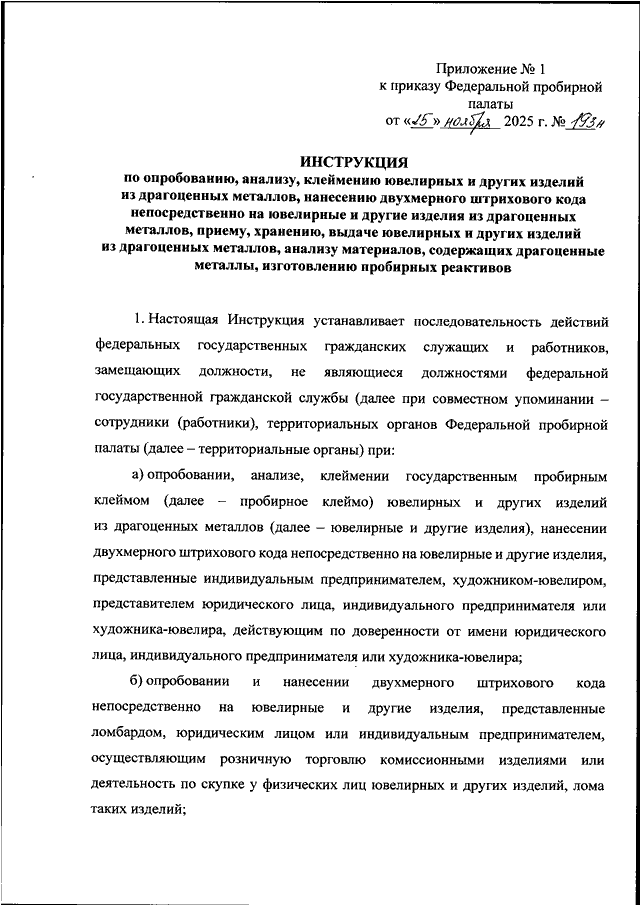 "ОБ УТВЕРЖДЕНИИ ИНСТРУКЦИИ ПО ОПРОБОВАНИЮ, АНАЛИЗУ, КЛЕЙМЕНИЮ ЮВЕЛИРНЫХ И ДРУГИХ ИЗДЕЛИЙ ИЗ ДРАГОЦЕННЫХ МЕТАЛЛОВ, НАНЕСЕНИЮ ДВУХМЕРНОГО ШТРИХОВОГО КОДА НЕПОСРЕДСТВЕННО НА ЮВЕЛИРНЫЕ И ДРУГИЕ ИЗДЕЛИЯ ИЗ ДРАГОЦЕННЫХ МЕТАЛЛОВ, ПРИЕМУ, ХРАНЕНИЮ, ВЫДАЧЕ ЮВЕЛИРНЫХ И ДРУГИХ ИЗДЕЛИЙ ИЗ ДРАГОЦЕННЫХ МЕТАЛЛОВ, АНАЛИЗУ МАТЕРИАЛОВ, СОДЕРЖАЩИХ ДРАГОЦЕННЫЕ МЕТАЛЛЫ, ИЗГОТОВЛЕНИЮ ПРОБИРНЫХ РЕАКТИВОВ И ФОРМ КВИТАНЦИЙ"