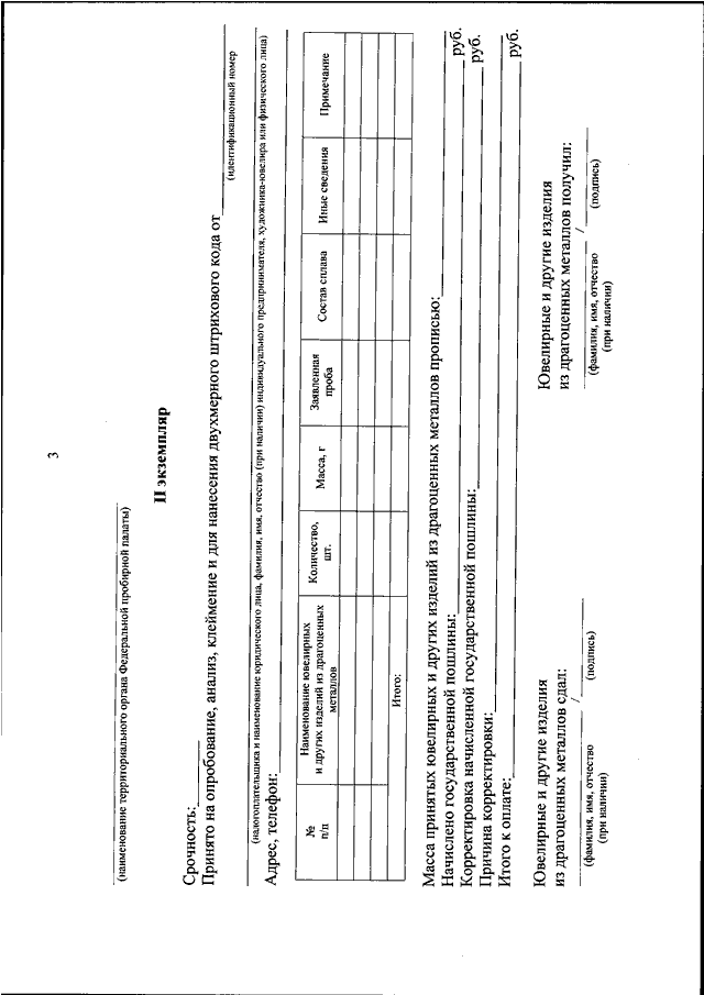"ОБ УТВЕРЖДЕНИИ ИНСТРУКЦИИ ПО ОПРОБОВАНИЮ, АНАЛИЗУ, КЛЕЙМЕНИЮ ЮВЕЛИРНЫХ И ДРУГИХ ИЗДЕЛИЙ ИЗ ДРАГОЦЕННЫХ МЕТАЛЛОВ, НАНЕСЕНИЮ ДВУХМЕРНОГО ШТРИХОВОГО КОДА НЕПОСРЕДСТВЕННО НА ЮВЕЛИРНЫЕ И ДРУГИЕ ИЗДЕЛИЯ ИЗ ДРАГОЦЕННЫХ МЕТАЛЛОВ, ПРИЕМУ, ХРАНЕНИЮ, ВЫДАЧЕ ЮВЕЛИРНЫХ И ДРУГИХ ИЗДЕЛИЙ ИЗ ДРАГОЦЕННЫХ МЕТАЛЛОВ, АНАЛИЗУ МАТЕРИАЛОВ, СОДЕРЖАЩИХ ДРАГОЦЕННЫЕ МЕТАЛЛЫ, ИЗГОТОВЛЕНИЮ ПРОБИРНЫХ РЕАКТИВОВ И ФОРМ КВИТАНЦИЙ"