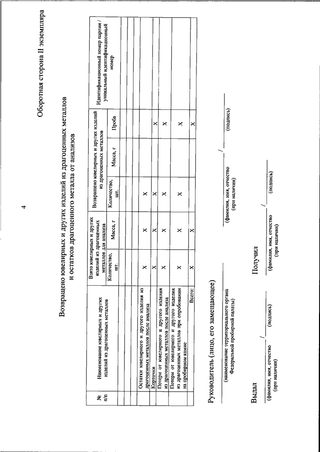 "ОБ УТВЕРЖДЕНИИ ИНСТРУКЦИИ ПО ОПРОБОВАНИЮ, АНАЛИЗУ, КЛЕЙМЕНИЮ ЮВЕЛИРНЫХ И ДРУГИХ ИЗДЕЛИЙ ИЗ ДРАГОЦЕННЫХ МЕТАЛЛОВ, НАНЕСЕНИЮ ДВУХМЕРНОГО ШТРИХОВОГО КОДА НЕПОСРЕДСТВЕННО НА ЮВЕЛИРНЫЕ И ДРУГИЕ ИЗДЕЛИЯ ИЗ ДРАГОЦЕННЫХ МЕТАЛЛОВ, ПРИЕМУ, ХРАНЕНИЮ, ВЫДАЧЕ ЮВЕЛИРНЫХ И ДРУГИХ ИЗДЕЛИЙ ИЗ ДРАГОЦЕННЫХ МЕТАЛЛОВ, АНАЛИЗУ МАТЕРИАЛОВ, СОДЕРЖАЩИХ ДРАГОЦЕННЫЕ МЕТАЛЛЫ, ИЗГОТОВЛЕНИЮ ПРОБИРНЫХ РЕАКТИВОВ И ФОРМ КВИТАНЦИЙ"