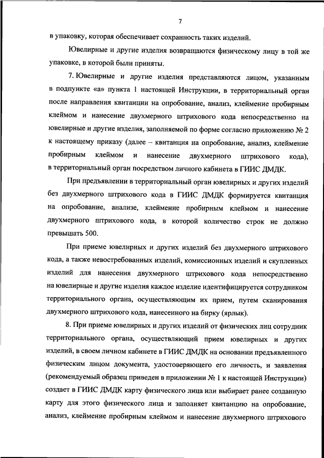 "ОБ УТВЕРЖДЕНИИ ИНСТРУКЦИИ ПО ОПРОБОВАНИЮ, АНАЛИЗУ, КЛЕЙМЕНИЮ ЮВЕЛИРНЫХ И ДРУГИХ ИЗДЕЛИЙ ИЗ ДРАГОЦЕННЫХ МЕТАЛЛОВ, НАНЕСЕНИЮ ДВУХМЕРНОГО ШТРИХОВОГО КОДА НЕПОСРЕДСТВЕННО НА ЮВЕЛИРНЫЕ И ДРУГИЕ ИЗДЕЛИЯ ИЗ ДРАГОЦЕННЫХ МЕТАЛЛОВ, ПРИЕМУ, ХРАНЕНИЮ, ВЫДАЧЕ ЮВЕЛИРНЫХ И ДРУГИХ ИЗДЕЛИЙ ИЗ ДРАГОЦЕННЫХ МЕТАЛЛОВ, АНАЛИЗУ МАТЕРИАЛОВ, СОДЕРЖАЩИХ ДРАГОЦЕННЫЕ МЕТАЛЛЫ, ИЗГОТОВЛЕНИЮ ПРОБИРНЫХ РЕАКТИВОВ И ФОРМ КВИТАНЦИЙ"
