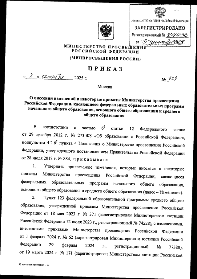 ПРИКАЗ Минпросвещения России от 08.10.2025 N 729