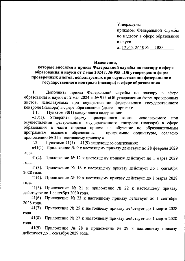 "О ВНЕСЕНИИ ИЗМЕНЕНИЙ В ПРИКАЗ ФЕДЕРАЛЬНОЙ СЛУЖБЫ ПО НАДЗОРУ В СФЕРЕ ОБРАЗОВАНИЯ И НАУКИ ОТ 2 МАЯ 2024 Г. N 955 "ОБ УТВЕРЖДЕНИИ ФОРМ ПРОВЕРОЧНЫХ ЛИСТОВ, ИСПОЛЬЗУЕМЫХ ПРИ ОСУЩЕСТВЛЕНИИ ФЕДЕРАЛЬНОГО ГОСУДАРСТВЕННОГО КОНТРОЛЯ (НАДЗОРА) В СФЕРЕ ОБРАЗОВАНИЯ"