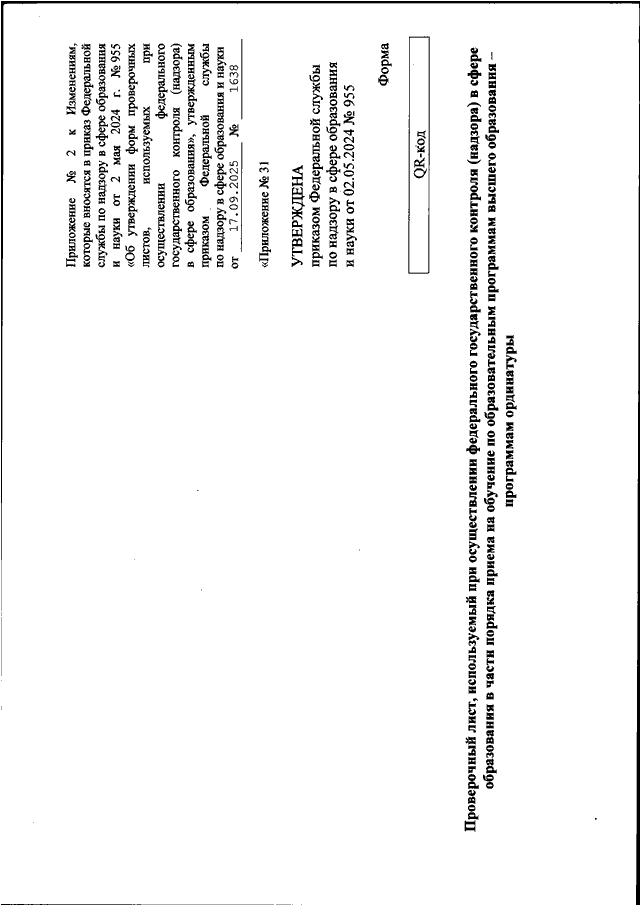 "О ВНЕСЕНИИ ИЗМЕНЕНИЙ В ПРИКАЗ ФЕДЕРАЛЬНОЙ СЛУЖБЫ ПО НАДЗОРУ В СФЕРЕ ОБРАЗОВАНИЯ И НАУКИ ОТ 2 МАЯ 2024 Г. N 955 "ОБ УТВЕРЖДЕНИИ ФОРМ ПРОВЕРОЧНЫХ ЛИСТОВ, ИСПОЛЬЗУЕМЫХ ПРИ ОСУЩЕСТВЛЕНИИ ФЕДЕРАЛЬНОГО ГОСУДАРСТВЕННОГО КОНТРОЛЯ (НАДЗОРА) В СФЕРЕ ОБРАЗОВАНИЯ"