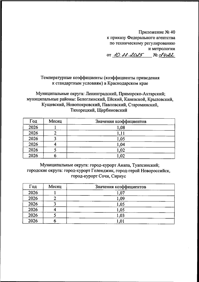 "ОБ УТВЕРЖДЕНИИ ТЕМПЕРАТУРНЫХ КОЭФФИЦИЕНТОВ (КОЭФФИЦИЕНТОВ ПРИВЕДЕНИЯ К СТАНДАРТНЫМ УСЛОВИЯМ) НА ПЕРВОЕ ПОЛУГОДИЕ 2026 ГОДА"