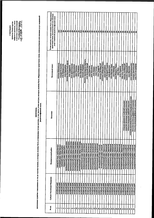 "ОБ УТВЕРЖДЕНИИ ПЕРЕЧНЯ НАСЕЛЕННЫХ ПУНКТОВ С НАСЕЛЕНИЕМ ОТ СТА ДО ТЫСЯЧИ ЧЕЛОВЕК, В КОТОРЫХ ДОЛЖНЫ БЫТЬ УСТАНОВЛЕНЫ ТОЧКИ ДОСТУПА, В ТОМ ЧИСЛЕ ТОЧКИ ДОСТУПА, КОТОРЫЕ ДОЛЖНЫ БЫТЬ ОБОРУДОВАНЫ СРЕДСТВАМИ СВЯЗИ, ИСПОЛЬЗУЕМЫМИ ДЛЯ ОКАЗАНИЯ УСЛУГ ПОДВИЖНОЙ РАДИОТЕЛЕФОННОЙ СВЯЗИ"
