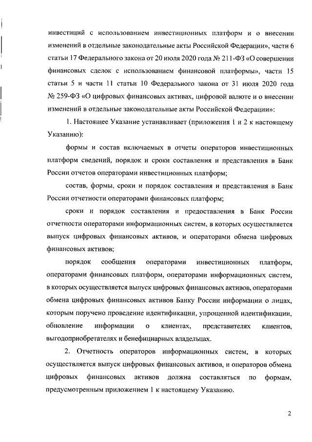 "О ПОРЯДКЕ И СРОКАХ СОСТАВЛЕНИЯ И ПРЕДСТАВЛЕНИЯ (ПРЕДОСТАВЛЕНИЯ) В БАНК РОССИИ ОТЧЕТОВ ОПЕРАТОРОВ ИНВЕСТИЦИОННЫХ ПЛАТФОРМ, ОТЧЕТНОСТИ ОПЕРАТОРОВ ФИНАНСОВЫХ ПЛАТФОРМ, ОПЕРАТОРОВ ИНФОРМАЦИОННЫХ СИСТЕМ, В КОТОРЫХ ОСУЩЕСТВЛЯЕТСЯ ВЫПУСК ЦИФРОВЫХ ФИНАНСОВЫХ АКТИВОВ, И ОПЕРАТОРОВ ОБМЕНА ЦИФРОВЫХ ФИНАНСОВЫХ АКТИВОВ, ФОРМЕ ОТЧЕТОВ ОПЕРАТОРОВ ИНВЕСТИЦИОННЫХ ПЛАТФОРМ И СОСТАВЕ ВКЛЮЧАЕМЫХ В НИХ СВЕДЕНИЙ, СОСТАВЕ И ФОРМАХ ОТЧЕТНОСТИ ОПЕРАТОРОВ ФИНАНСОВЫХ ПЛАТФОРМ, А ТАКЖЕ О ПОРЯДКЕ СООБЩЕНИЯ ОПЕРАТОРАМИ ИНВЕСТИЦИОННЫХ ПЛАТФОРМ, ОПЕРАТОРАМИ ФИНАНСОВЫХ ПЛАТФОРМ, ОПЕРАТОРАМИ ИНФОРМАЦИОННЫХ СИСТЕМ, В КОТОРЫХ ОСУЩЕСТВЛЯЕТСЯ ВЫПУСК ЦИФРОВЫХ ФИНАНСОВЫХ АКТИВОВ, ОПЕРАТОРАМИ ОБМЕНА ЦИФРОВЫХ ФИНАНСОВЫХ АКТИВОВ БАНКУ РОССИИ ИНФОРМАЦИИ О ЛИЦАХ, КОТОРЫМ ПОРУЧЕНО ПРОВЕДЕНИЕ ИДЕНТИФИКАЦИИ, УПРОЩЕННОЙ ИДЕНТИФИКАЦИИ, ОБНОВЛЕНИЕ ИНФОРМАЦИИ О КЛИЕНТАХ, ПРЕДСТАВИТЕЛЯХ КЛИЕНТОВ, ВЫГОДОПРЕОБРЕТАТЕЛЯХ И БЕНЕФИЦИАРНЫХ ВЛАДЕЛЬЦАХ"