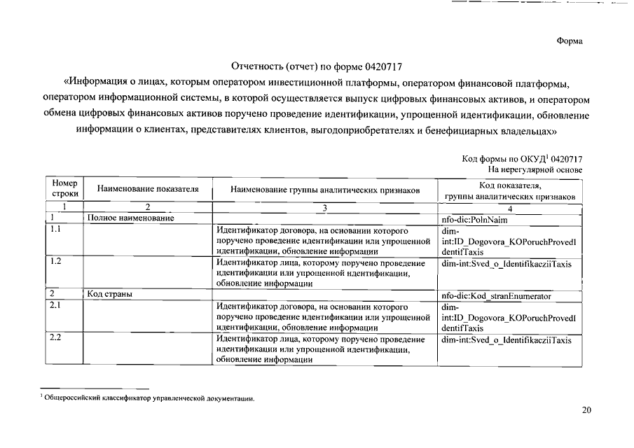 "О ПОРЯДКЕ И СРОКАХ СОСТАВЛЕНИЯ И ПРЕДСТАВЛЕНИЯ (ПРЕДОСТАВЛЕНИЯ) В БАНК РОССИИ ОТЧЕТОВ ОПЕРАТОРОВ ИНВЕСТИЦИОННЫХ ПЛАТФОРМ, ОТЧЕТНОСТИ ОПЕРАТОРОВ ФИНАНСОВЫХ ПЛАТФОРМ, ОПЕРАТОРОВ ИНФОРМАЦИОННЫХ СИСТЕМ, В КОТОРЫХ ОСУЩЕСТВЛЯЕТСЯ ВЫПУСК ЦИФРОВЫХ ФИНАНСОВЫХ АКТИВОВ, И ОПЕРАТОРОВ ОБМЕНА ЦИФРОВЫХ ФИНАНСОВЫХ АКТИВОВ, ФОРМЕ ОТЧЕТОВ ОПЕРАТОРОВ ИНВЕСТИЦИОННЫХ ПЛАТФОРМ И СОСТАВЕ ВКЛЮЧАЕМЫХ В НИХ СВЕДЕНИЙ, СОСТАВЕ И ФОРМАХ ОТЧЕТНОСТИ ОПЕРАТОРОВ ФИНАНСОВЫХ ПЛАТФОРМ, А ТАКЖЕ О ПОРЯДКЕ СООБЩЕНИЯ ОПЕРАТОРАМИ ИНВЕСТИЦИОННЫХ ПЛАТФОРМ, ОПЕРАТОРАМИ ФИНАНСОВЫХ ПЛАТФОРМ, ОПЕРАТОРАМИ ИНФОРМАЦИОННЫХ СИСТЕМ, В КОТОРЫХ ОСУЩЕСТВЛЯЕТСЯ ВЫПУСК ЦИФРОВЫХ ФИНАНСОВЫХ АКТИВОВ, ОПЕРАТОРАМИ ОБМЕНА ЦИФРОВЫХ ФИНАНСОВЫХ АКТИВОВ БАНКУ РОССИИ ИНФОРМАЦИИ О ЛИЦАХ, КОТОРЫМ ПОРУЧЕНО ПРОВЕДЕНИЕ ИДЕНТИФИКАЦИИ, УПРОЩЕННОЙ ИДЕНТИФИКАЦИИ, ОБНОВЛЕНИЕ ИНФОРМАЦИИ О КЛИЕНТАХ, ПРЕДСТАВИТЕЛЯХ КЛИЕНТОВ, ВЫГОДОПРЕОБРЕТАТЕЛЯХ И БЕНЕФИЦИАРНЫХ ВЛАДЕЛЬЦАХ"
