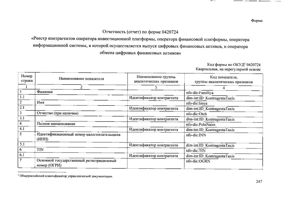 "О ПОРЯДКЕ И СРОКАХ СОСТАВЛЕНИЯ И ПРЕДСТАВЛЕНИЯ (ПРЕДОСТАВЛЕНИЯ) В БАНК РОССИИ ОТЧЕТОВ ОПЕРАТОРОВ ИНВЕСТИЦИОННЫХ ПЛАТФОРМ, ОТЧЕТНОСТИ ОПЕРАТОРОВ ФИНАНСОВЫХ ПЛАТФОРМ, ОПЕРАТОРОВ ИНФОРМАЦИОННЫХ СИСТЕМ, В КОТОРЫХ ОСУЩЕСТВЛЯЕТСЯ ВЫПУСК ЦИФРОВЫХ ФИНАНСОВЫХ АКТИВОВ, И ОПЕРАТОРОВ ОБМЕНА ЦИФРОВЫХ ФИНАНСОВЫХ АКТИВОВ, ФОРМЕ ОТЧЕТОВ ОПЕРАТОРОВ ИНВЕСТИЦИОННЫХ ПЛАТФОРМ И СОСТАВЕ ВКЛЮЧАЕМЫХ В НИХ СВЕДЕНИЙ, СОСТАВЕ И ФОРМАХ ОТЧЕТНОСТИ ОПЕРАТОРОВ ФИНАНСОВЫХ ПЛАТФОРМ, А ТАКЖЕ О ПОРЯДКЕ СООБЩЕНИЯ ОПЕРАТОРАМИ ИНВЕСТИЦИОННЫХ ПЛАТФОРМ, ОПЕРАТОРАМИ ФИНАНСОВЫХ ПЛАТФОРМ, ОПЕРАТОРАМИ ИНФОРМАЦИОННЫХ СИСТЕМ, В КОТОРЫХ ОСУЩЕСТВЛЯЕТСЯ ВЫПУСК ЦИФРОВЫХ ФИНАНСОВЫХ АКТИВОВ, ОПЕРАТОРАМИ ОБМЕНА ЦИФРОВЫХ ФИНАНСОВЫХ АКТИВОВ БАНКУ РОССИИ ИНФОРМАЦИИ О ЛИЦАХ, КОТОРЫМ ПОРУЧЕНО ПРОВЕДЕНИЕ ИДЕНТИФИКАЦИИ, УПРОЩЕННОЙ ИДЕНТИФИКАЦИИ, ОБНОВЛЕНИЕ ИНФОРМАЦИИ О КЛИЕНТАХ, ПРЕДСТАВИТЕЛЯХ КЛИЕНТОВ, ВЫГОДОПРЕОБРЕТАТЕЛЯХ И БЕНЕФИЦИАРНЫХ ВЛАДЕЛЬЦАХ"