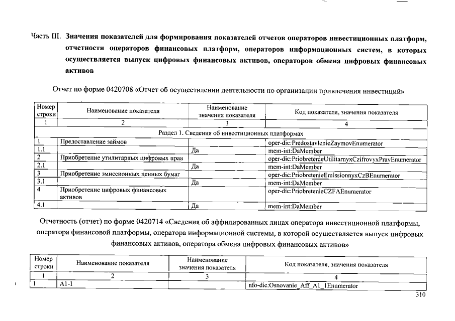 "О ПОРЯДКЕ И СРОКАХ СОСТАВЛЕНИЯ И ПРЕДСТАВЛЕНИЯ (ПРЕДОСТАВЛЕНИЯ) В БАНК РОССИИ ОТЧЕТОВ ОПЕРАТОРОВ ИНВЕСТИЦИОННЫХ ПЛАТФОРМ, ОТЧЕТНОСТИ ОПЕРАТОРОВ ФИНАНСОВЫХ ПЛАТФОРМ, ОПЕРАТОРОВ ИНФОРМАЦИОННЫХ СИСТЕМ, В КОТОРЫХ ОСУЩЕСТВЛЯЕТСЯ ВЫПУСК ЦИФРОВЫХ ФИНАНСОВЫХ АКТИВОВ, И ОПЕРАТОРОВ ОБМЕНА ЦИФРОВЫХ ФИНАНСОВЫХ АКТИВОВ, ФОРМЕ ОТЧЕТОВ ОПЕРАТОРОВ ИНВЕСТИЦИОННЫХ ПЛАТФОРМ И СОСТАВЕ ВКЛЮЧАЕМЫХ В НИХ СВЕДЕНИЙ, СОСТАВЕ И ФОРМАХ ОТЧЕТНОСТИ ОПЕРАТОРОВ ФИНАНСОВЫХ ПЛАТФОРМ, А ТАКЖЕ О ПОРЯДКЕ СООБЩЕНИЯ ОПЕРАТОРАМИ ИНВЕСТИЦИОННЫХ ПЛАТФОРМ, ОПЕРАТОРАМИ ФИНАНСОВЫХ ПЛАТФОРМ, ОПЕРАТОРАМИ ИНФОРМАЦИОННЫХ СИСТЕМ, В КОТОРЫХ ОСУЩЕСТВЛЯЕТСЯ ВЫПУСК ЦИФРОВЫХ ФИНАНСОВЫХ АКТИВОВ, ОПЕРАТОРАМИ ОБМЕНА ЦИФРОВЫХ ФИНАНСОВЫХ АКТИВОВ БАНКУ РОССИИ ИНФОРМАЦИИ О ЛИЦАХ, КОТОРЫМ ПОРУЧЕНО ПРОВЕДЕНИЕ ИДЕНТИФИКАЦИИ, УПРОЩЕННОЙ ИДЕНТИФИКАЦИИ, ОБНОВЛЕНИЕ ИНФОРМАЦИИ О КЛИЕНТАХ, ПРЕДСТАВИТЕЛЯХ КЛИЕНТОВ, ВЫГОДОПРЕОБРЕТАТЕЛЯХ И БЕНЕФИЦИАРНЫХ ВЛАДЕЛЬЦАХ"