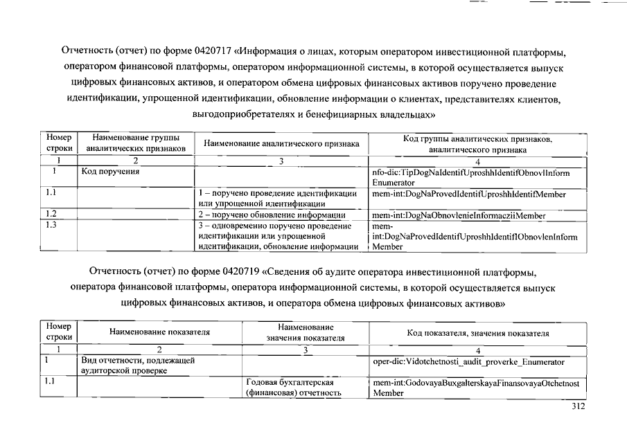 "О ПОРЯДКЕ И СРОКАХ СОСТАВЛЕНИЯ И ПРЕДСТАВЛЕНИЯ (ПРЕДОСТАВЛЕНИЯ) В БАНК РОССИИ ОТЧЕТОВ ОПЕРАТОРОВ ИНВЕСТИЦИОННЫХ ПЛАТФОРМ, ОТЧЕТНОСТИ ОПЕРАТОРОВ ФИНАНСОВЫХ ПЛАТФОРМ, ОПЕРАТОРОВ ИНФОРМАЦИОННЫХ СИСТЕМ, В КОТОРЫХ ОСУЩЕСТВЛЯЕТСЯ ВЫПУСК ЦИФРОВЫХ ФИНАНСОВЫХ АКТИВОВ, И ОПЕРАТОРОВ ОБМЕНА ЦИФРОВЫХ ФИНАНСОВЫХ АКТИВОВ, ФОРМЕ ОТЧЕТОВ ОПЕРАТОРОВ ИНВЕСТИЦИОННЫХ ПЛАТФОРМ И СОСТАВЕ ВКЛЮЧАЕМЫХ В НИХ СВЕДЕНИЙ, СОСТАВЕ И ФОРМАХ ОТЧЕТНОСТИ ОПЕРАТОРОВ ФИНАНСОВЫХ ПЛАТФОРМ, А ТАКЖЕ О ПОРЯДКЕ СООБЩЕНИЯ ОПЕРАТОРАМИ ИНВЕСТИЦИОННЫХ ПЛАТФОРМ, ОПЕРАТОРАМИ ФИНАНСОВЫХ ПЛАТФОРМ, ОПЕРАТОРАМИ ИНФОРМАЦИОННЫХ СИСТЕМ, В КОТОРЫХ ОСУЩЕСТВЛЯЕТСЯ ВЫПУСК ЦИФРОВЫХ ФИНАНСОВЫХ АКТИВОВ, ОПЕРАТОРАМИ ОБМЕНА ЦИФРОВЫХ ФИНАНСОВЫХ АКТИВОВ БАНКУ РОССИИ ИНФОРМАЦИИ О ЛИЦАХ, КОТОРЫМ ПОРУЧЕНО ПРОВЕДЕНИЕ ИДЕНТИФИКАЦИИ, УПРОЩЕННОЙ ИДЕНТИФИКАЦИИ, ОБНОВЛЕНИЕ ИНФОРМАЦИИ О КЛИЕНТАХ, ПРЕДСТАВИТЕЛЯХ КЛИЕНТОВ, ВЫГОДОПРЕОБРЕТАТЕЛЯХ И БЕНЕФИЦИАРНЫХ ВЛАДЕЛЬЦАХ"