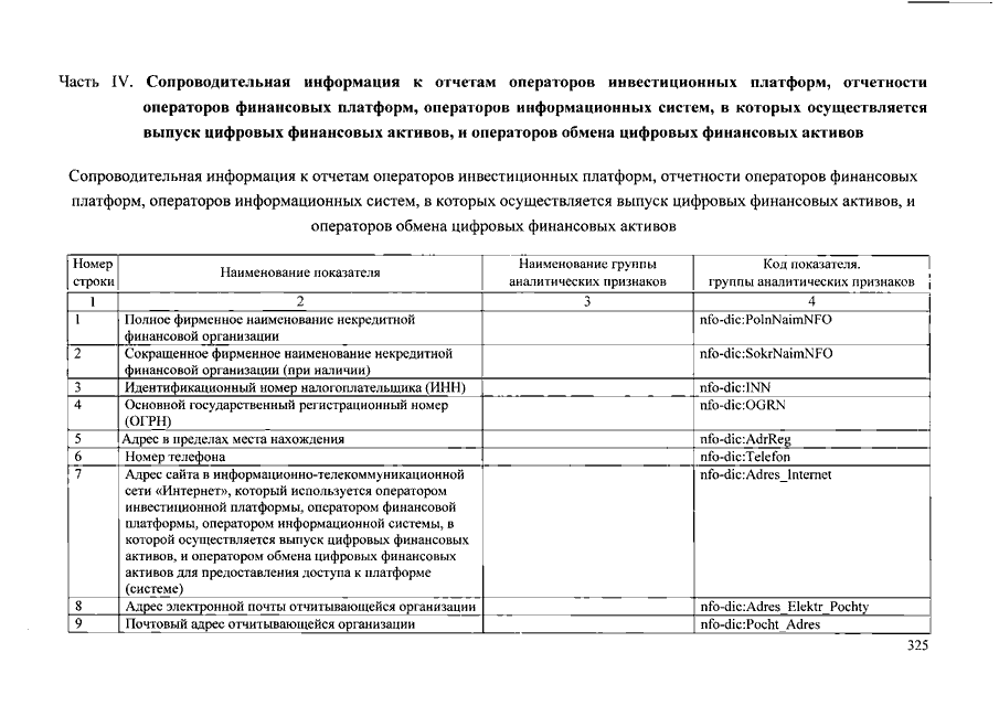 "О ПОРЯДКЕ И СРОКАХ СОСТАВЛЕНИЯ И ПРЕДСТАВЛЕНИЯ (ПРЕДОСТАВЛЕНИЯ) В БАНК РОССИИ ОТЧЕТОВ ОПЕРАТОРОВ ИНВЕСТИЦИОННЫХ ПЛАТФОРМ, ОТЧЕТНОСТИ ОПЕРАТОРОВ ФИНАНСОВЫХ ПЛАТФОРМ, ОПЕРАТОРОВ ИНФОРМАЦИОННЫХ СИСТЕМ, В КОТОРЫХ ОСУЩЕСТВЛЯЕТСЯ ВЫПУСК ЦИФРОВЫХ ФИНАНСОВЫХ АКТИВОВ, И ОПЕРАТОРОВ ОБМЕНА ЦИФРОВЫХ ФИНАНСОВЫХ АКТИВОВ, ФОРМЕ ОТЧЕТОВ ОПЕРАТОРОВ ИНВЕСТИЦИОННЫХ ПЛАТФОРМ И СОСТАВЕ ВКЛЮЧАЕМЫХ В НИХ СВЕДЕНИЙ, СОСТАВЕ И ФОРМАХ ОТЧЕТНОСТИ ОПЕРАТОРОВ ФИНАНСОВЫХ ПЛАТФОРМ, А ТАКЖЕ О ПОРЯДКЕ СООБЩЕНИЯ ОПЕРАТОРАМИ ИНВЕСТИЦИОННЫХ ПЛАТФОРМ, ОПЕРАТОРАМИ ФИНАНСОВЫХ ПЛАТФОРМ, ОПЕРАТОРАМИ ИНФОРМАЦИОННЫХ СИСТЕМ, В КОТОРЫХ ОСУЩЕСТВЛЯЕТСЯ ВЫПУСК ЦИФРОВЫХ ФИНАНСОВЫХ АКТИВОВ, ОПЕРАТОРАМИ ОБМЕНА ЦИФРОВЫХ ФИНАНСОВЫХ АКТИВОВ БАНКУ РОССИИ ИНФОРМАЦИИ О ЛИЦАХ, КОТОРЫМ ПОРУЧЕНО ПРОВЕДЕНИЕ ИДЕНТИФИКАЦИИ, УПРОЩЕННОЙ ИДЕНТИФИКАЦИИ, ОБНОВЛЕНИЕ ИНФОРМАЦИИ О КЛИЕНТАХ, ПРЕДСТАВИТЕЛЯХ КЛИЕНТОВ, ВЫГОДОПРЕОБРЕТАТЕЛЯХ И БЕНЕФИЦИАРНЫХ ВЛАДЕЛЬЦАХ"