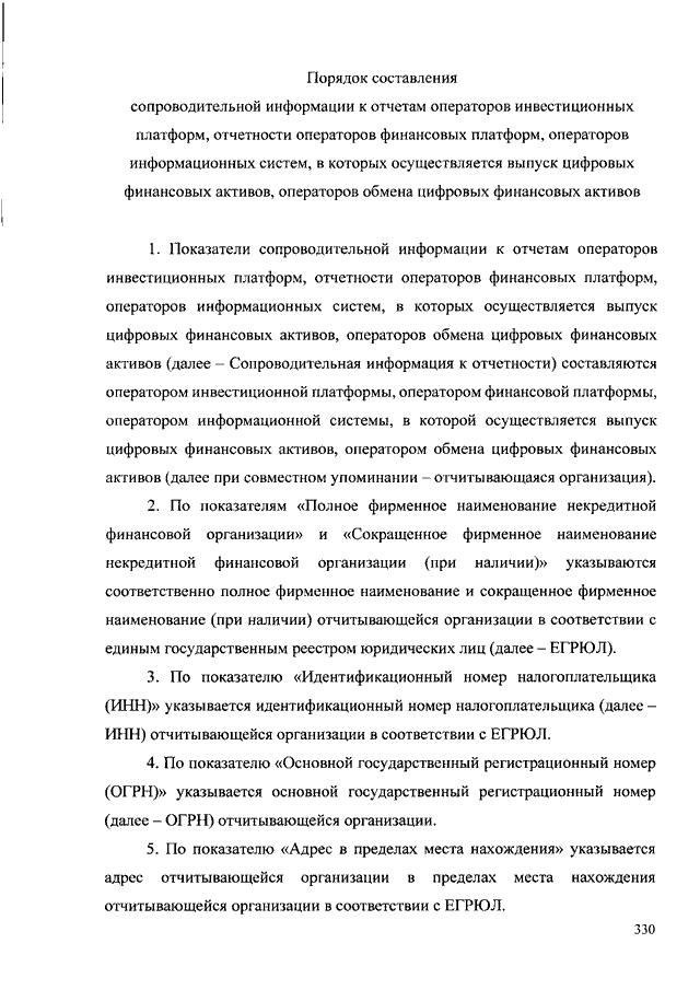 "О ПОРЯДКЕ И СРОКАХ СОСТАВЛЕНИЯ И ПРЕДСТАВЛЕНИЯ (ПРЕДОСТАВЛЕНИЯ) В БАНК РОССИИ ОТЧЕТОВ ОПЕРАТОРОВ ИНВЕСТИЦИОННЫХ ПЛАТФОРМ, ОТЧЕТНОСТИ ОПЕРАТОРОВ ФИНАНСОВЫХ ПЛАТФОРМ, ОПЕРАТОРОВ ИНФОРМАЦИОННЫХ СИСТЕМ, В КОТОРЫХ ОСУЩЕСТВЛЯЕТСЯ ВЫПУСК ЦИФРОВЫХ ФИНАНСОВЫХ АКТИВОВ, И ОПЕРАТОРОВ ОБМЕНА ЦИФРОВЫХ ФИНАНСОВЫХ АКТИВОВ, ФОРМЕ ОТЧЕТОВ ОПЕРАТОРОВ ИНВЕСТИЦИОННЫХ ПЛАТФОРМ И СОСТАВЕ ВКЛЮЧАЕМЫХ В НИХ СВЕДЕНИЙ, СОСТАВЕ И ФОРМАХ ОТЧЕТНОСТИ ОПЕРАТОРОВ ФИНАНСОВЫХ ПЛАТФОРМ, А ТАКЖЕ О ПОРЯДКЕ СООБЩЕНИЯ ОПЕРАТОРАМИ ИНВЕСТИЦИОННЫХ ПЛАТФОРМ, ОПЕРАТОРАМИ ФИНАНСОВЫХ ПЛАТФОРМ, ОПЕРАТОРАМИ ИНФОРМАЦИОННЫХ СИСТЕМ, В КОТОРЫХ ОСУЩЕСТВЛЯЕТСЯ ВЫПУСК ЦИФРОВЫХ ФИНАНСОВЫХ АКТИВОВ, ОПЕРАТОРАМИ ОБМЕНА ЦИФРОВЫХ ФИНАНСОВЫХ АКТИВОВ БАНКУ РОССИИ ИНФОРМАЦИИ О ЛИЦАХ, КОТОРЫМ ПОРУЧЕНО ПРОВЕДЕНИЕ ИДЕНТИФИКАЦИИ, УПРОЩЕННОЙ ИДЕНТИФИКАЦИИ, ОБНОВЛЕНИЕ ИНФОРМАЦИИ О КЛИЕНТАХ, ПРЕДСТАВИТЕЛЯХ КЛИЕНТОВ, ВЫГОДОПРЕОБРЕТАТЕЛЯХ И БЕНЕФИЦИАРНЫХ ВЛАДЕЛЬЦАХ"