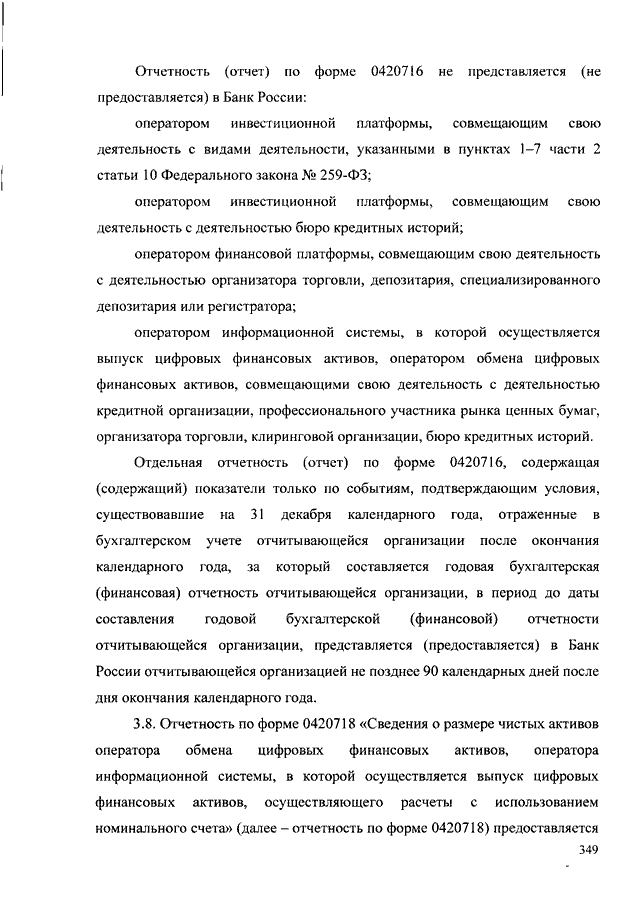 "О ПОРЯДКЕ И СРОКАХ СОСТАВЛЕНИЯ И ПРЕДСТАВЛЕНИЯ (ПРЕДОСТАВЛЕНИЯ) В БАНК РОССИИ ОТЧЕТОВ ОПЕРАТОРОВ ИНВЕСТИЦИОННЫХ ПЛАТФОРМ, ОТЧЕТНОСТИ ОПЕРАТОРОВ ФИНАНСОВЫХ ПЛАТФОРМ, ОПЕРАТОРОВ ИНФОРМАЦИОННЫХ СИСТЕМ, В КОТОРЫХ ОСУЩЕСТВЛЯЕТСЯ ВЫПУСК ЦИФРОВЫХ ФИНАНСОВЫХ АКТИВОВ, И ОПЕРАТОРОВ ОБМЕНА ЦИФРОВЫХ ФИНАНСОВЫХ АКТИВОВ, ФОРМЕ ОТЧЕТОВ ОПЕРАТОРОВ ИНВЕСТИЦИОННЫХ ПЛАТФОРМ И СОСТАВЕ ВКЛЮЧАЕМЫХ В НИХ СВЕДЕНИЙ, СОСТАВЕ И ФОРМАХ ОТЧЕТНОСТИ ОПЕРАТОРОВ ФИНАНСОВЫХ ПЛАТФОРМ, А ТАКЖЕ О ПОРЯДКЕ СООБЩЕНИЯ ОПЕРАТОРАМИ ИНВЕСТИЦИОННЫХ ПЛАТФОРМ, ОПЕРАТОРАМИ ФИНАНСОВЫХ ПЛАТФОРМ, ОПЕРАТОРАМИ ИНФОРМАЦИОННЫХ СИСТЕМ, В КОТОРЫХ ОСУЩЕСТВЛЯЕТСЯ ВЫПУСК ЦИФРОВЫХ ФИНАНСОВЫХ АКТИВОВ, ОПЕРАТОРАМИ ОБМЕНА ЦИФРОВЫХ ФИНАНСОВЫХ АКТИВОВ БАНКУ РОССИИ ИНФОРМАЦИИ О ЛИЦАХ, КОТОРЫМ ПОРУЧЕНО ПРОВЕДЕНИЕ ИДЕНТИФИКАЦИИ, УПРОЩЕННОЙ ИДЕНТИФИКАЦИИ, ОБНОВЛЕНИЕ ИНФОРМАЦИИ О КЛИЕНТАХ, ПРЕДСТАВИТЕЛЯХ КЛИЕНТОВ, ВЫГОДОПРЕОБРЕТАТЕЛЯХ И БЕНЕФИЦИАРНЫХ ВЛАДЕЛЬЦАХ"