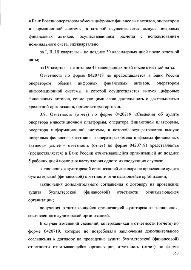 "О ПОРЯДКЕ И СРОКАХ СОСТАВЛЕНИЯ И ПРЕДСТАВЛЕНИЯ (ПРЕДОСТАВЛЕНИЯ) В БАНК РОССИИ ОТЧЕТОВ ОПЕРАТОРОВ ИНВЕСТИЦИОННЫХ ПЛАТФОРМ, ОТЧЕТНОСТИ ОПЕРАТОРОВ ФИНАНСОВЫХ ПЛАТФОРМ, ОПЕРАТОРОВ ИНФОРМАЦИОННЫХ СИСТЕМ, В КОТОРЫХ ОСУЩЕСТВЛЯЕТСЯ ВЫПУСК ЦИФРОВЫХ ФИНАНСОВЫХ АКТИВОВ, И ОПЕРАТОРОВ ОБМЕНА ЦИФРОВЫХ ФИНАНСОВЫХ АКТИВОВ, ФОРМЕ ОТЧЕТОВ ОПЕРАТОРОВ ИНВЕСТИЦИОННЫХ ПЛАТФОРМ И СОСТАВЕ ВКЛЮЧАЕМЫХ В НИХ СВЕДЕНИЙ, СОСТАВЕ И ФОРМАХ ОТЧЕТНОСТИ ОПЕРАТОРОВ ФИНАНСОВЫХ ПЛАТФОРМ, А ТАКЖЕ О ПОРЯДКЕ СООБЩЕНИЯ ОПЕРАТОРАМИ ИНВЕСТИЦИОННЫХ ПЛАТФОРМ, ОПЕРАТОРАМИ ФИНАНСОВЫХ ПЛАТФОРМ, ОПЕРАТОРАМИ ИНФОРМАЦИОННЫХ СИСТЕМ, В КОТОРЫХ ОСУЩЕСТВЛЯЕТСЯ ВЫПУСК ЦИФРОВЫХ ФИНАНСОВЫХ АКТИВОВ, ОПЕРАТОРАМИ ОБМЕНА ЦИФРОВЫХ ФИНАНСОВЫХ АКТИВОВ БАНКУ РОССИИ ИНФОРМАЦИИ О ЛИЦАХ, КОТОРЫМ ПОРУЧЕНО ПРОВЕДЕНИЕ ИДЕНТИФИКАЦИИ, УПРОЩЕННОЙ ИДЕНТИФИКАЦИИ, ОБНОВЛЕНИЕ ИНФОРМАЦИИ О КЛИЕНТАХ, ПРЕДСТАВИТЕЛЯХ КЛИЕНТОВ, ВЫГОДОПРЕОБРЕТАТЕЛЯХ И БЕНЕФИЦИАРНЫХ ВЛАДЕЛЬЦАХ"