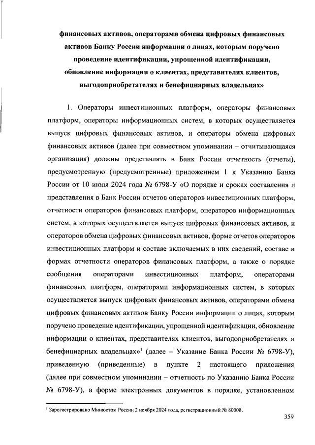 "О ПОРЯДКЕ И СРОКАХ СОСТАВЛЕНИЯ И ПРЕДСТАВЛЕНИЯ (ПРЕДОСТАВЛЕНИЯ) В БАНК РОССИИ ОТЧЕТОВ ОПЕРАТОРОВ ИНВЕСТИЦИОННЫХ ПЛАТФОРМ, ОТЧЕТНОСТИ ОПЕРАТОРОВ ФИНАНСОВЫХ ПЛАТФОРМ, ОПЕРАТОРОВ ИНФОРМАЦИОННЫХ СИСТЕМ, В КОТОРЫХ ОСУЩЕСТВЛЯЕТСЯ ВЫПУСК ЦИФРОВЫХ ФИНАНСОВЫХ АКТИВОВ, И ОПЕРАТОРОВ ОБМЕНА ЦИФРОВЫХ ФИНАНСОВЫХ АКТИВОВ, ФОРМЕ ОТЧЕТОВ ОПЕРАТОРОВ ИНВЕСТИЦИОННЫХ ПЛАТФОРМ И СОСТАВЕ ВКЛЮЧАЕМЫХ В НИХ СВЕДЕНИЙ, СОСТАВЕ И ФОРМАХ ОТЧЕТНОСТИ ОПЕРАТОРОВ ФИНАНСОВЫХ ПЛАТФОРМ, А ТАКЖЕ О ПОРЯДКЕ СООБЩЕНИЯ ОПЕРАТОРАМИ ИНВЕСТИЦИОННЫХ ПЛАТФОРМ, ОПЕРАТОРАМИ ФИНАНСОВЫХ ПЛАТФОРМ, ОПЕРАТОРАМИ ИНФОРМАЦИОННЫХ СИСТЕМ, В КОТОРЫХ ОСУЩЕСТВЛЯЕТСЯ ВЫПУСК ЦИФРОВЫХ ФИНАНСОВЫХ АКТИВОВ, ОПЕРАТОРАМИ ОБМЕНА ЦИФРОВЫХ ФИНАНСОВЫХ АКТИВОВ БАНКУ РОССИИ ИНФОРМАЦИИ О ЛИЦАХ, КОТОРЫМ ПОРУЧЕНО ПРОВЕДЕНИЕ ИДЕНТИФИКАЦИИ, УПРОЩЕННОЙ ИДЕНТИФИКАЦИИ, ОБНОВЛЕНИЕ ИНФОРМАЦИИ О КЛИЕНТАХ, ПРЕДСТАВИТЕЛЯХ КЛИЕНТОВ, ВЫГОДОПРЕОБРЕТАТЕЛЯХ И БЕНЕФИЦИАРНЫХ ВЛАДЕЛЬЦАХ"