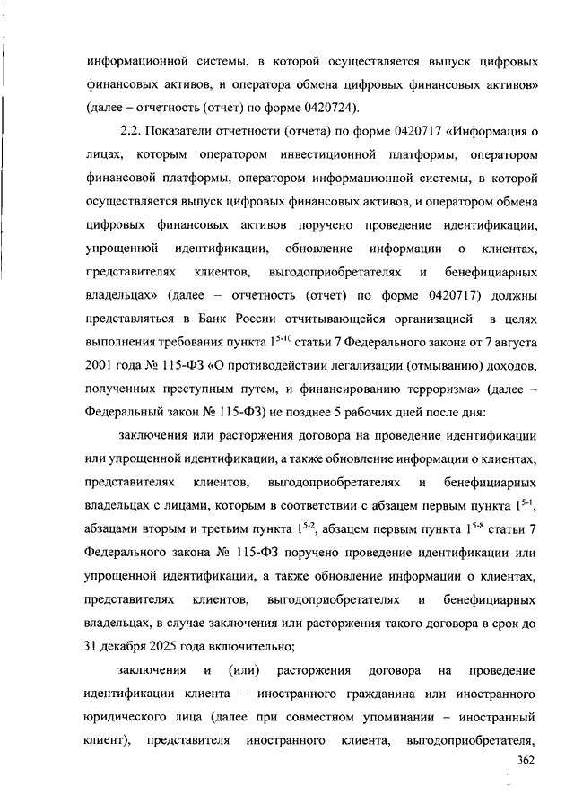 "О ПОРЯДКЕ И СРОКАХ СОСТАВЛЕНИЯ И ПРЕДСТАВЛЕНИЯ (ПРЕДОСТАВЛЕНИЯ) В БАНК РОССИИ ОТЧЕТОВ ОПЕРАТОРОВ ИНВЕСТИЦИОННЫХ ПЛАТФОРМ, ОТЧЕТНОСТИ ОПЕРАТОРОВ ФИНАНСОВЫХ ПЛАТФОРМ, ОПЕРАТОРОВ ИНФОРМАЦИОННЫХ СИСТЕМ, В КОТОРЫХ ОСУЩЕСТВЛЯЕТСЯ ВЫПУСК ЦИФРОВЫХ ФИНАНСОВЫХ АКТИВОВ, И ОПЕРАТОРОВ ОБМЕНА ЦИФРОВЫХ ФИНАНСОВЫХ АКТИВОВ, ФОРМЕ ОТЧЕТОВ ОПЕРАТОРОВ ИНВЕСТИЦИОННЫХ ПЛАТФОРМ И СОСТАВЕ ВКЛЮЧАЕМЫХ В НИХ СВЕДЕНИЙ, СОСТАВЕ И ФОРМАХ ОТЧЕТНОСТИ ОПЕРАТОРОВ ФИНАНСОВЫХ ПЛАТФОРМ, А ТАКЖЕ О ПОРЯДКЕ СООБЩЕНИЯ ОПЕРАТОРАМИ ИНВЕСТИЦИОННЫХ ПЛАТФОРМ, ОПЕРАТОРАМИ ФИНАНСОВЫХ ПЛАТФОРМ, ОПЕРАТОРАМИ ИНФОРМАЦИОННЫХ СИСТЕМ, В КОТОРЫХ ОСУЩЕСТВЛЯЕТСЯ ВЫПУСК ЦИФРОВЫХ ФИНАНСОВЫХ АКТИВОВ, ОПЕРАТОРАМИ ОБМЕНА ЦИФРОВЫХ ФИНАНСОВЫХ АКТИВОВ БАНКУ РОССИИ ИНФОРМАЦИИ О ЛИЦАХ, КОТОРЫМ ПОРУЧЕНО ПРОВЕДЕНИЕ ИДЕНТИФИКАЦИИ, УПРОЩЕННОЙ ИДЕНТИФИКАЦИИ, ОБНОВЛЕНИЕ ИНФОРМАЦИИ О КЛИЕНТАХ, ПРЕДСТАВИТЕЛЯХ КЛИЕНТОВ, ВЫГОДОПРЕОБРЕТАТЕЛЯХ И БЕНЕФИЦИАРНЫХ ВЛАДЕЛЬЦАХ"